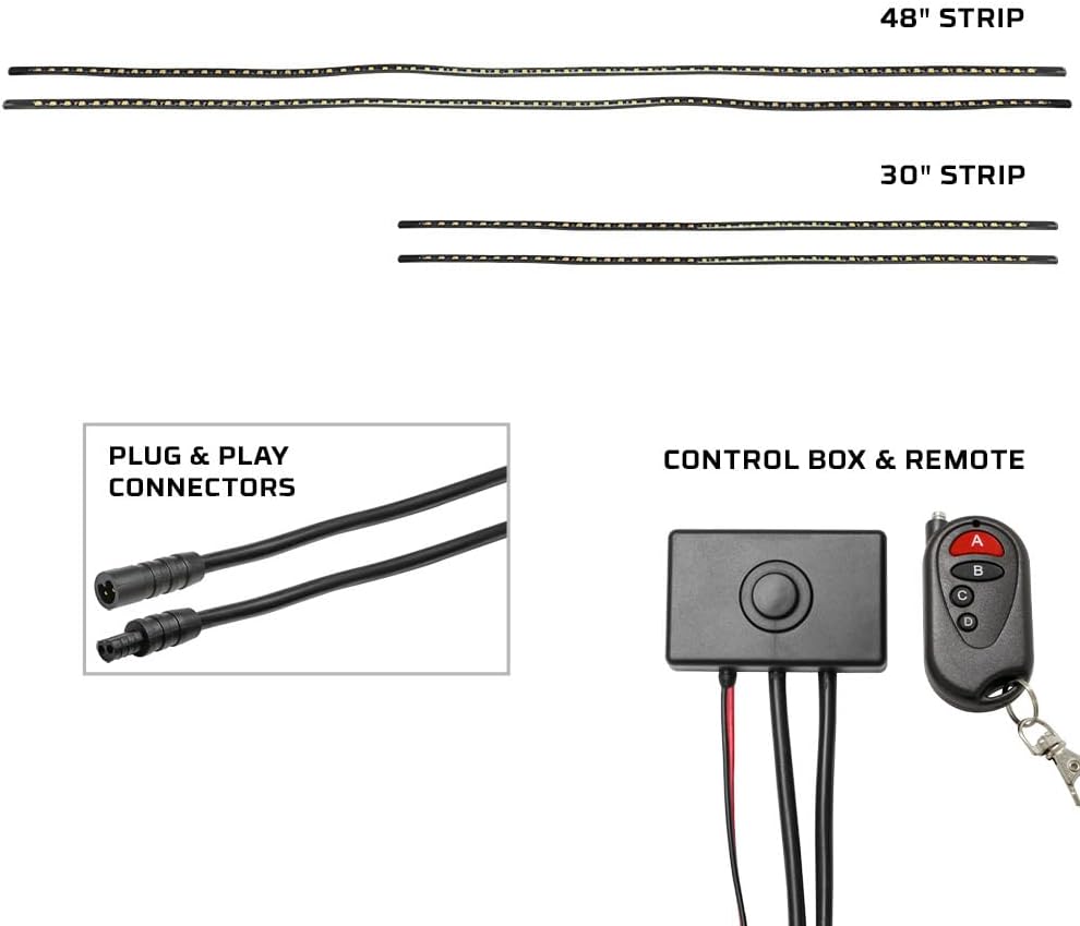 - Includes (2) 48" & (2) 30" Water-Resistant, Flexible Underbody Strips that House 234 SMD LEDs, Control Box, Wireless Remote, Mounting Brackets, Screws & Zip Ties