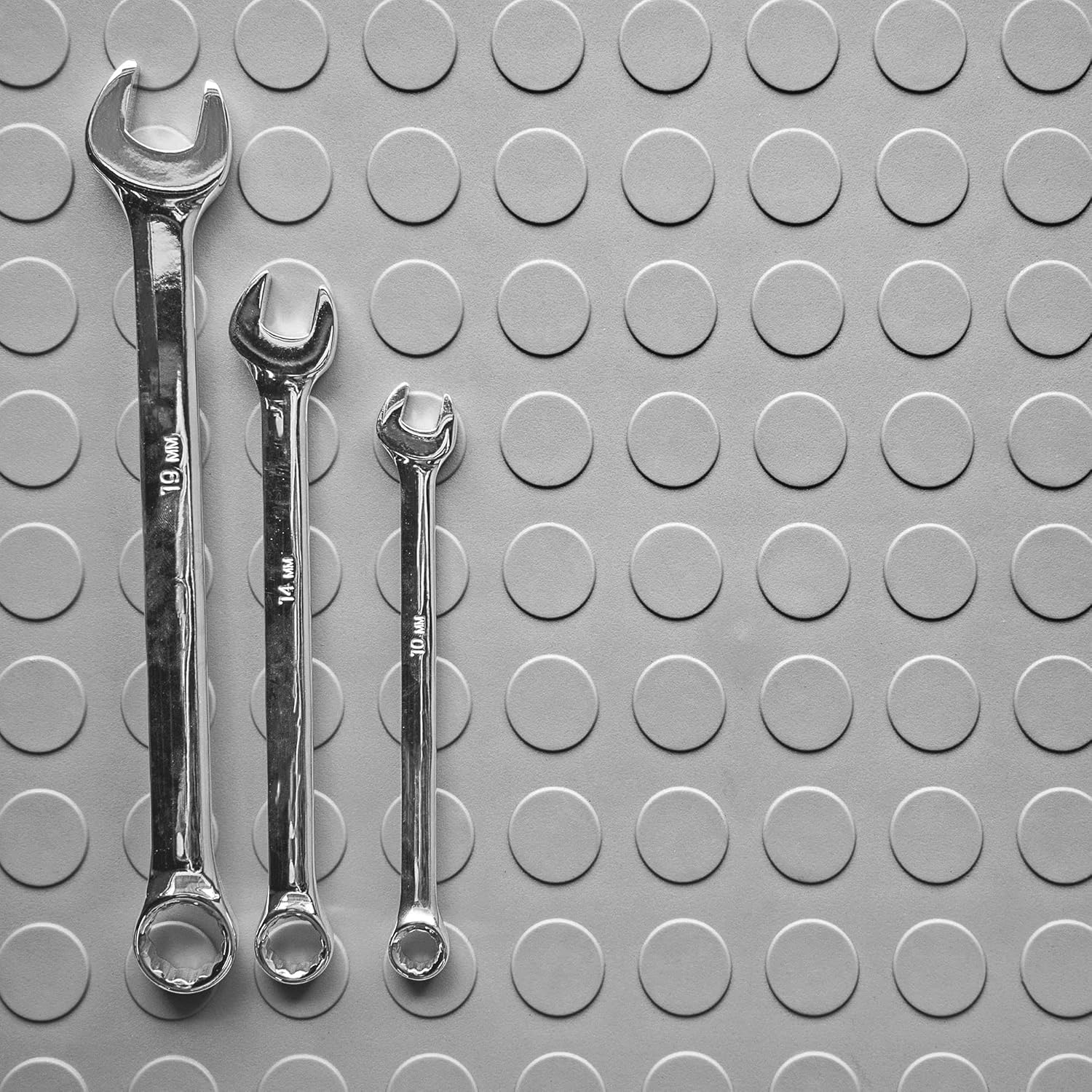 - SLEEK COIN-TOP TEXTURE: Made for easy cleaning and installation, these garage flooring mats are easy to trim and designed to fill the room with fewer pieces, offering a near seamless edge-to-edge work surface that allows equipment to move freely.