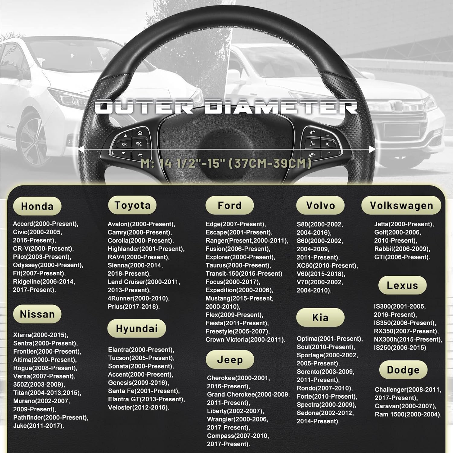 - READY TO INSTALL: Warm up the steering cover, and slip it on your steering wheel. Installation is fairly easy, any adult can install this steering wheel cover. Suitable for standard size steering wheels with outer diameter of 14 1/2-15 inches, please carefully measure the size of your steering wheel before purchasing.