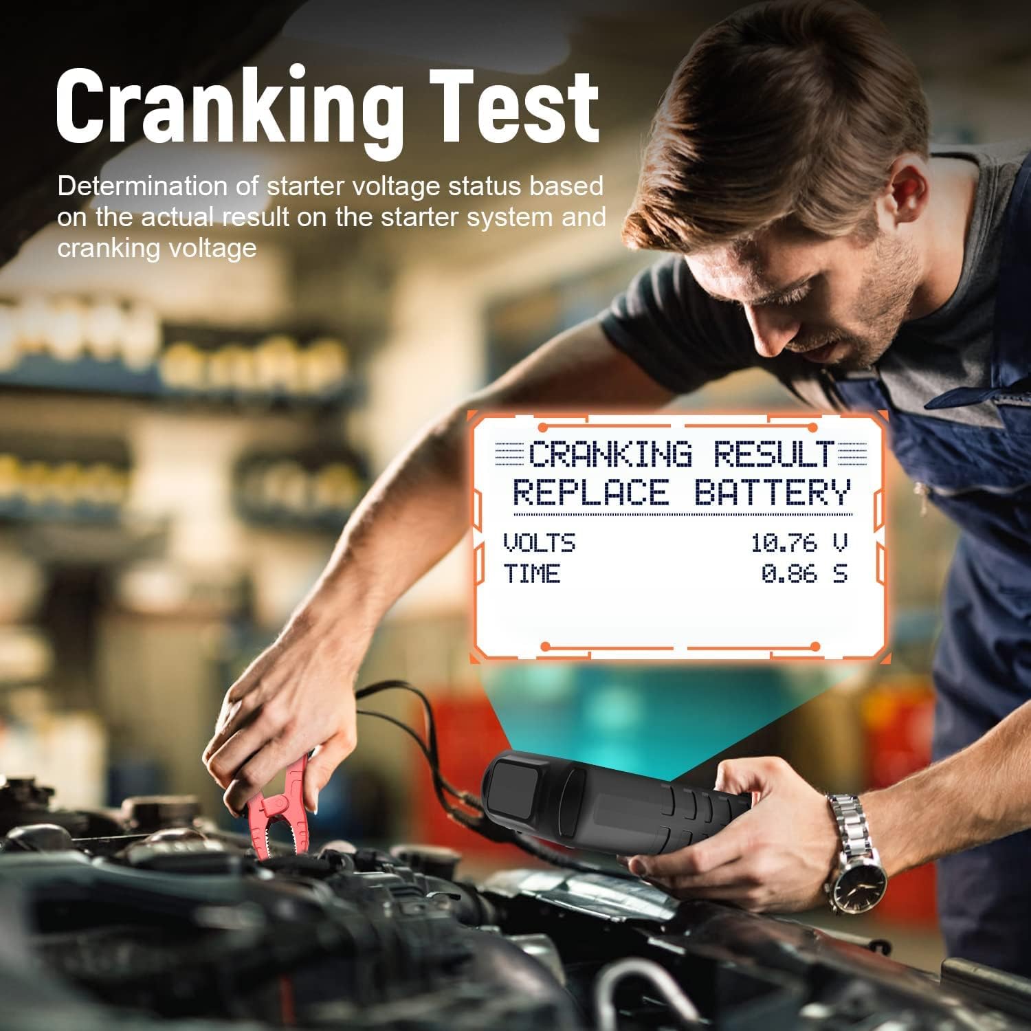 - Cranking & Charging System Test - Even below 0°F, this cold cranking amps (CCA) tester can accurately test the cranking system by turning on the engine and measuring cranking voltage and time. This battery checker tester helps detect weak batteries before failure. If SOH is normal but the car wonât start, check the starter or ignition system. After cranking test, this battery tester auto-switches to charging system test, assessing alternator output voltage, rectifier diode function, and charging current to identify issues like no output, low output, high output, or excessive ripple.
