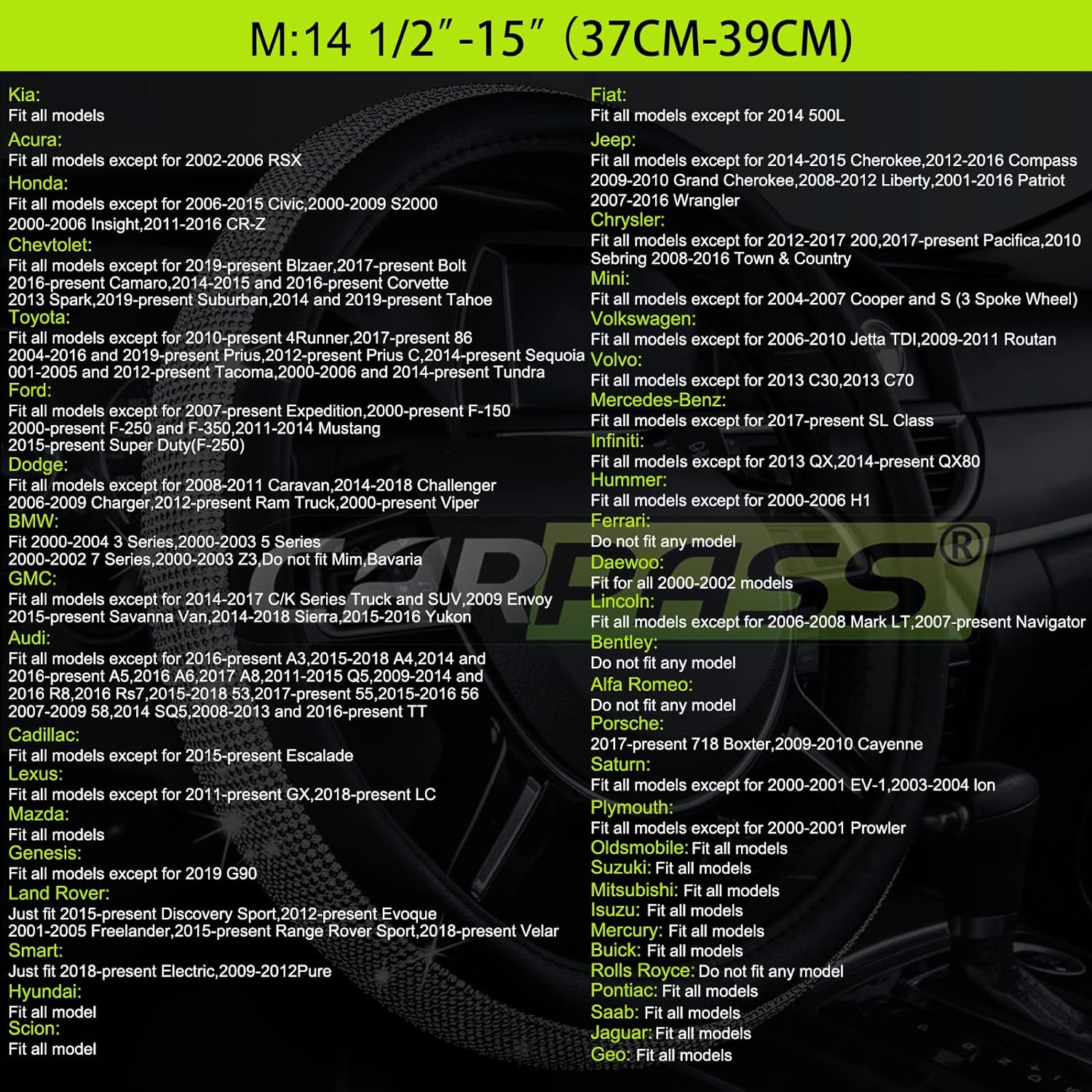 - BREATAHBLE DESIGN AND EASY TO INSTALL. FIT MOST OF VEHICLES.Easy Slip on Installation and Breathable design. It is very thick and well padded but has grooves for a superior grip. Rrich Color Options.Easy Installation - fits all standard steering wheels 14.5" to 15" and can be put on effortlessly in seconds