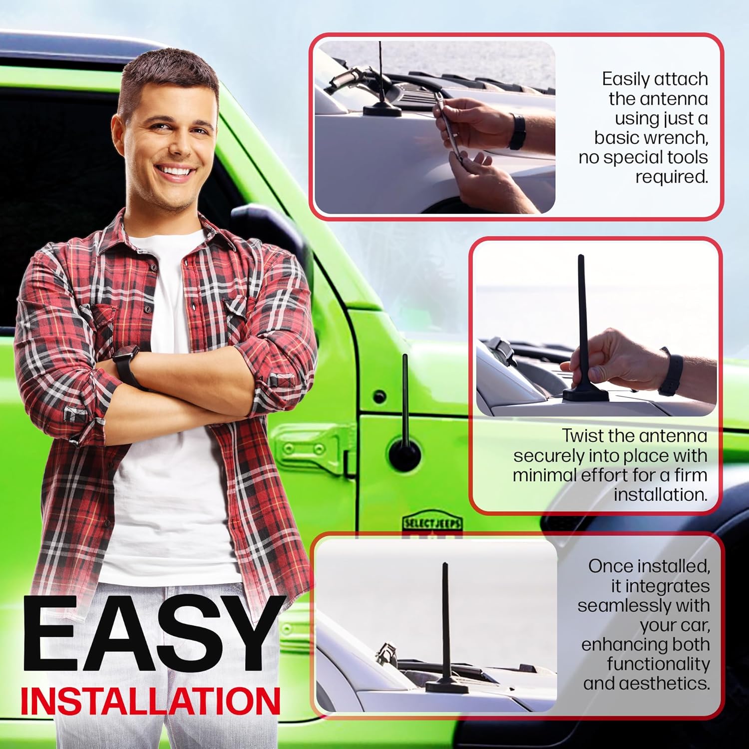 - QUICK INSTALLATION - Featuring a simple screw-on design, this short antenna can be installed quickly and easily, taking just minutes to complete. Its hassle-free installation process allows you to instantly enhance your appearance and enjoy improved performance for Jeep Wrangler / Gladiator's without any complications.