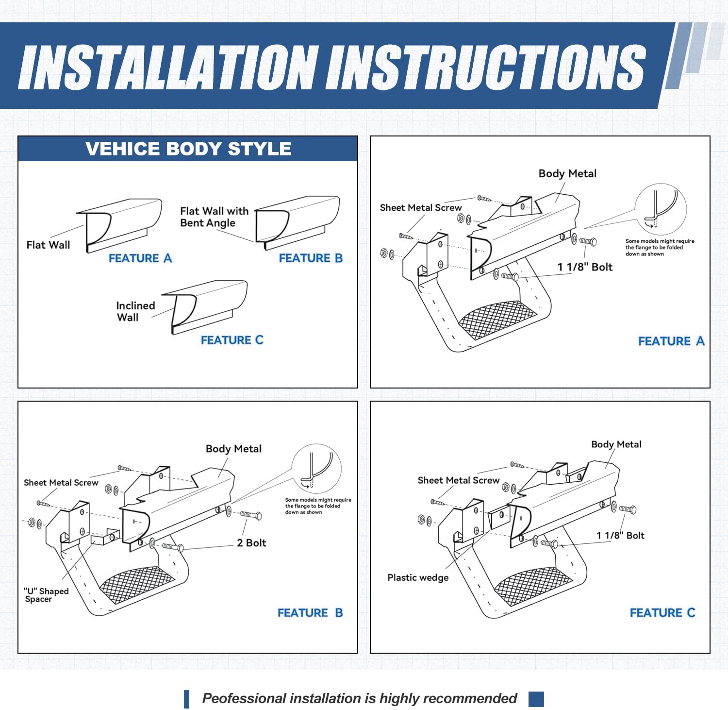 - Set of 2 - These steps are designed to be installed on both the driver's and passenger's side and comes with a matching pair. All mounting hardware is included.