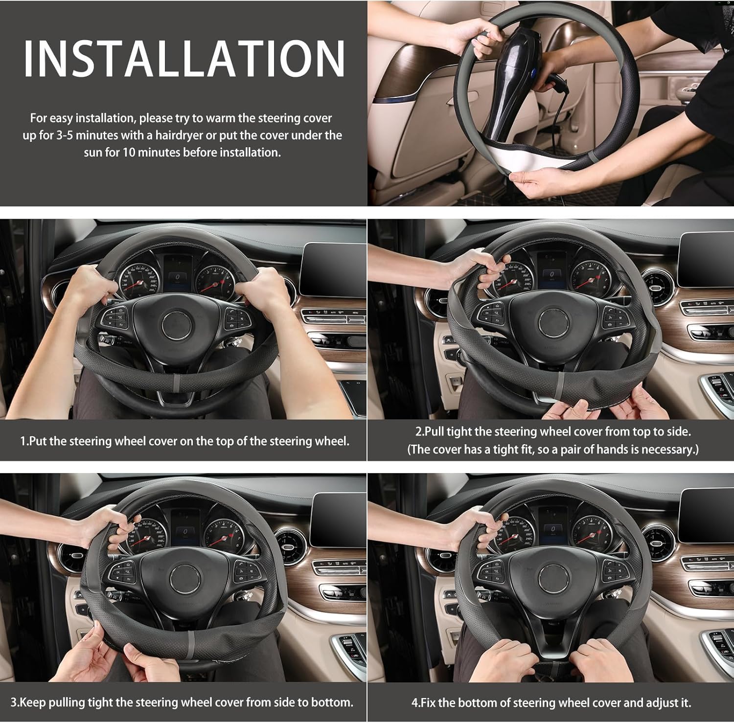 - Quick Install with Heat Flexibility: For a custom fit, gently warm the suv steering wheel cover with a hair dryer or sunlight (5-10 minutes) before sliding it onto your steering wheel. The slightly stiff material softens when heated, ensuring a wrinkle-free finish. Video installation method is available