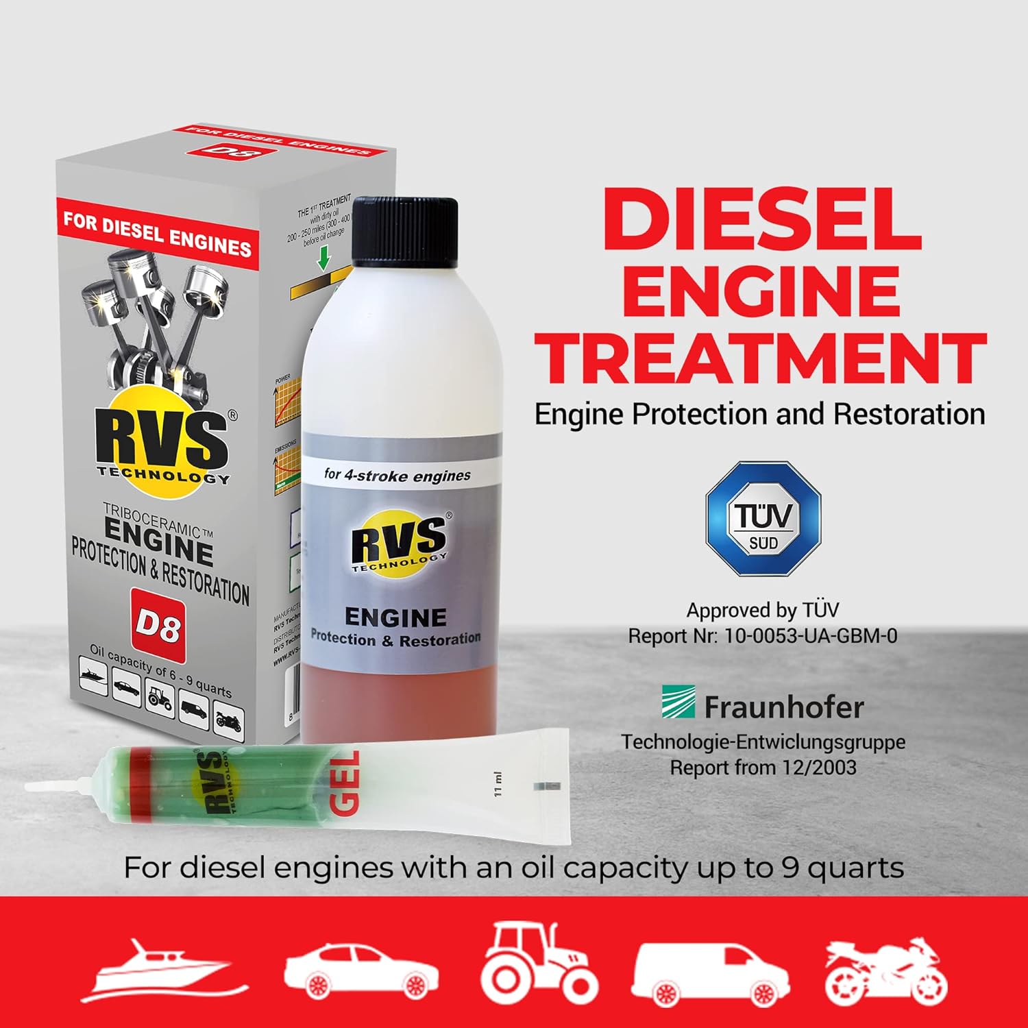 D8 engine oil treatment, For Diesel engines with a motor oil capacity up to 9 quarts; Safely Restore and protect your Car, Truck, Motorcycle and all other engines