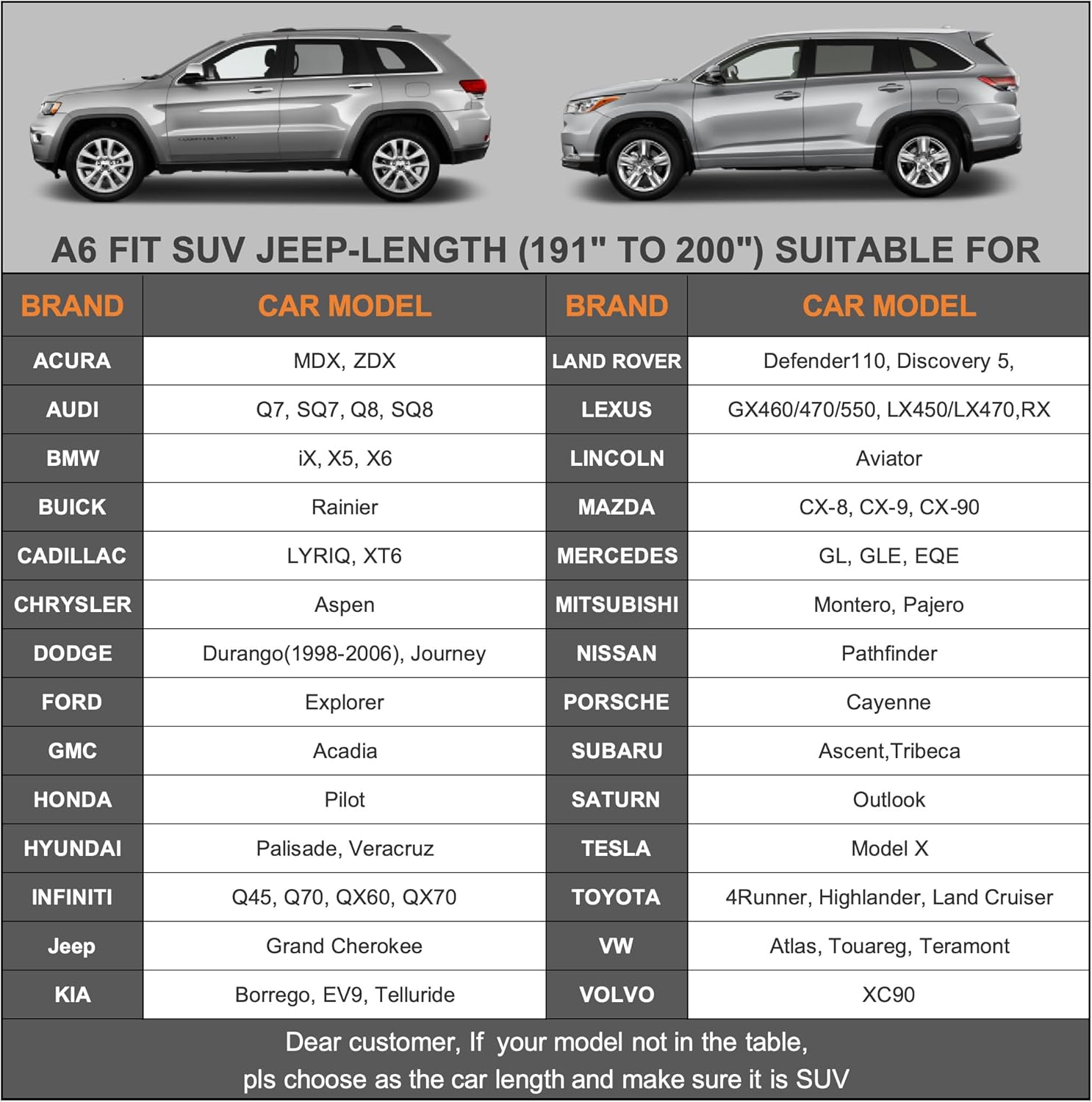- ăDimension A6ăUniversal fit for Suv which length is 191-201 inch (Not for hatchback and sedan). Suitable for Toyota Highlander/Land Cruiser, Honda pilot, Acura Mdx/Zdx, Cadillac XT6, Lexus RX/LX, Infiniti FX/QX60/70, Kia Telluride, Hyundai Palisade/Veracruz, Nisan Pathfinder, Porsche Cayenne, Audi Q7/Q8, BMW X5/X6, Mercedes GLE, VW Atlas/Touareg, Tesla Model X etc.