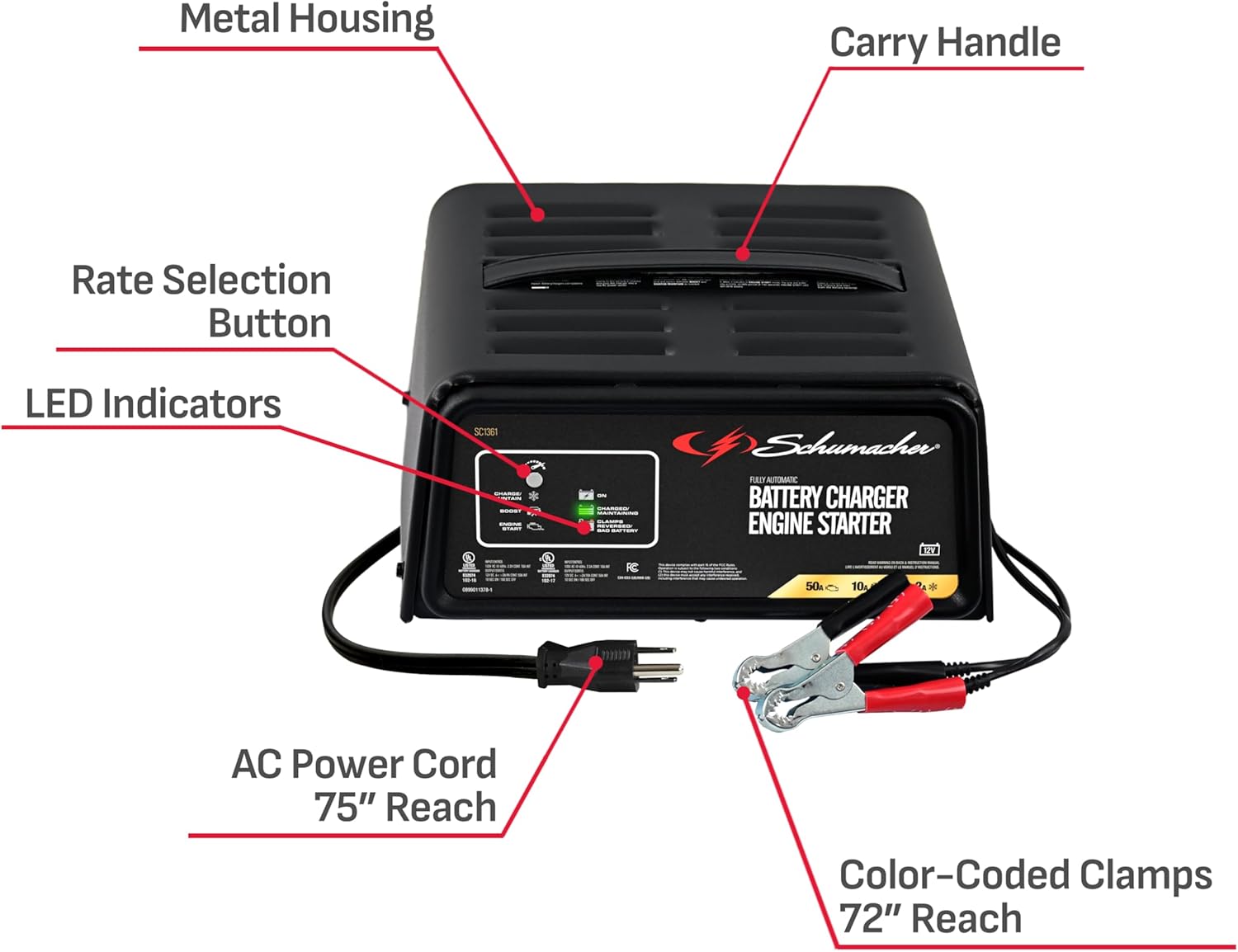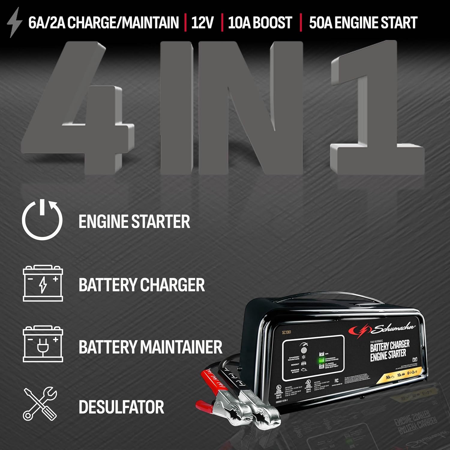 Schumacher Electric 50A 12V Car Battery Charger, Engine Starter & Maintainer - Fully Automatic Battery Charger for Cars, Trucks & RVs - 6A Charge/ 2A Maintain & 10A Boost Modes - SC1361