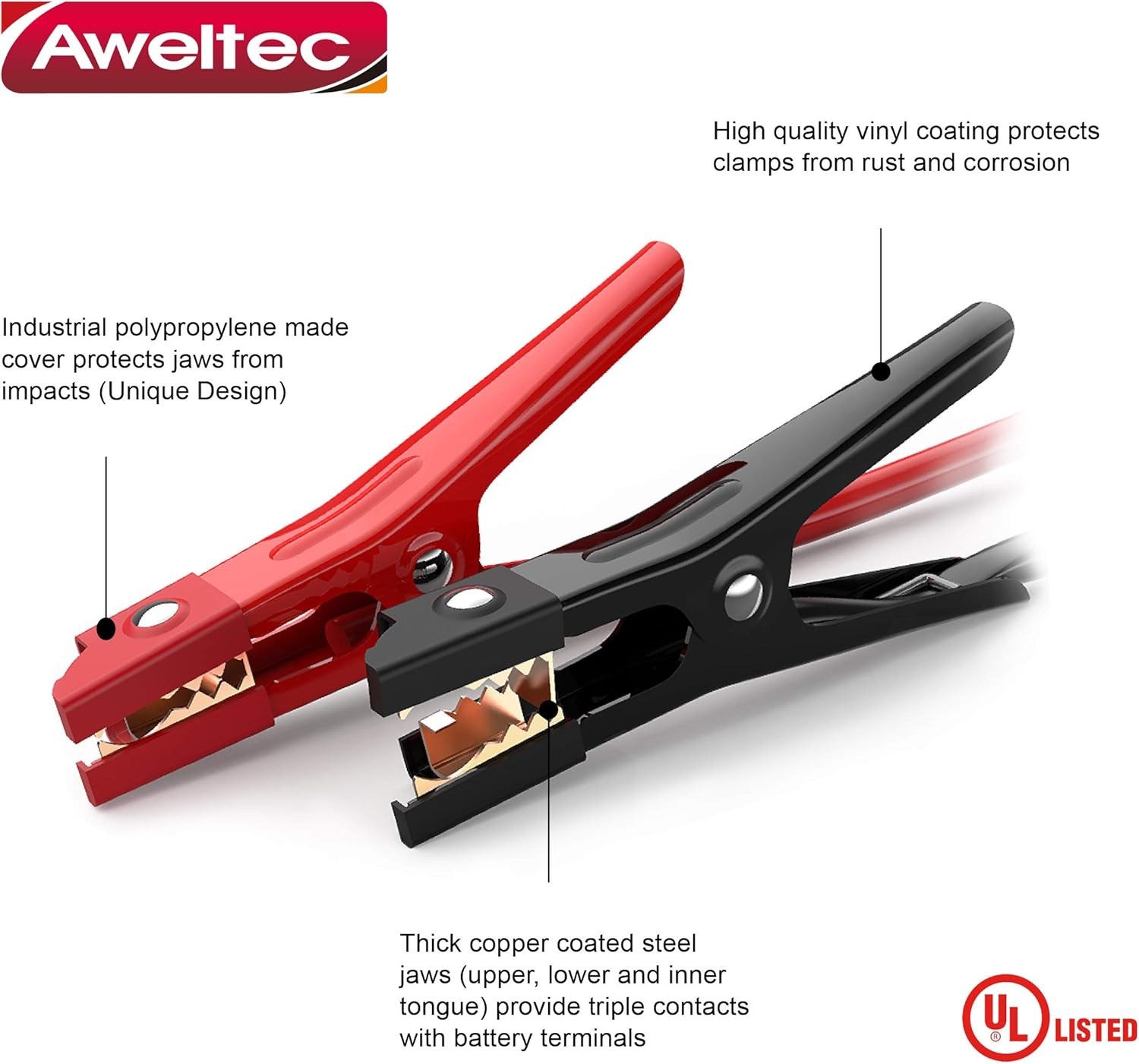 - AWELTEC 20 Foot length makes it easy to reach from one car battery to another, Unique Design clamps suitable for various cars and connection ways.