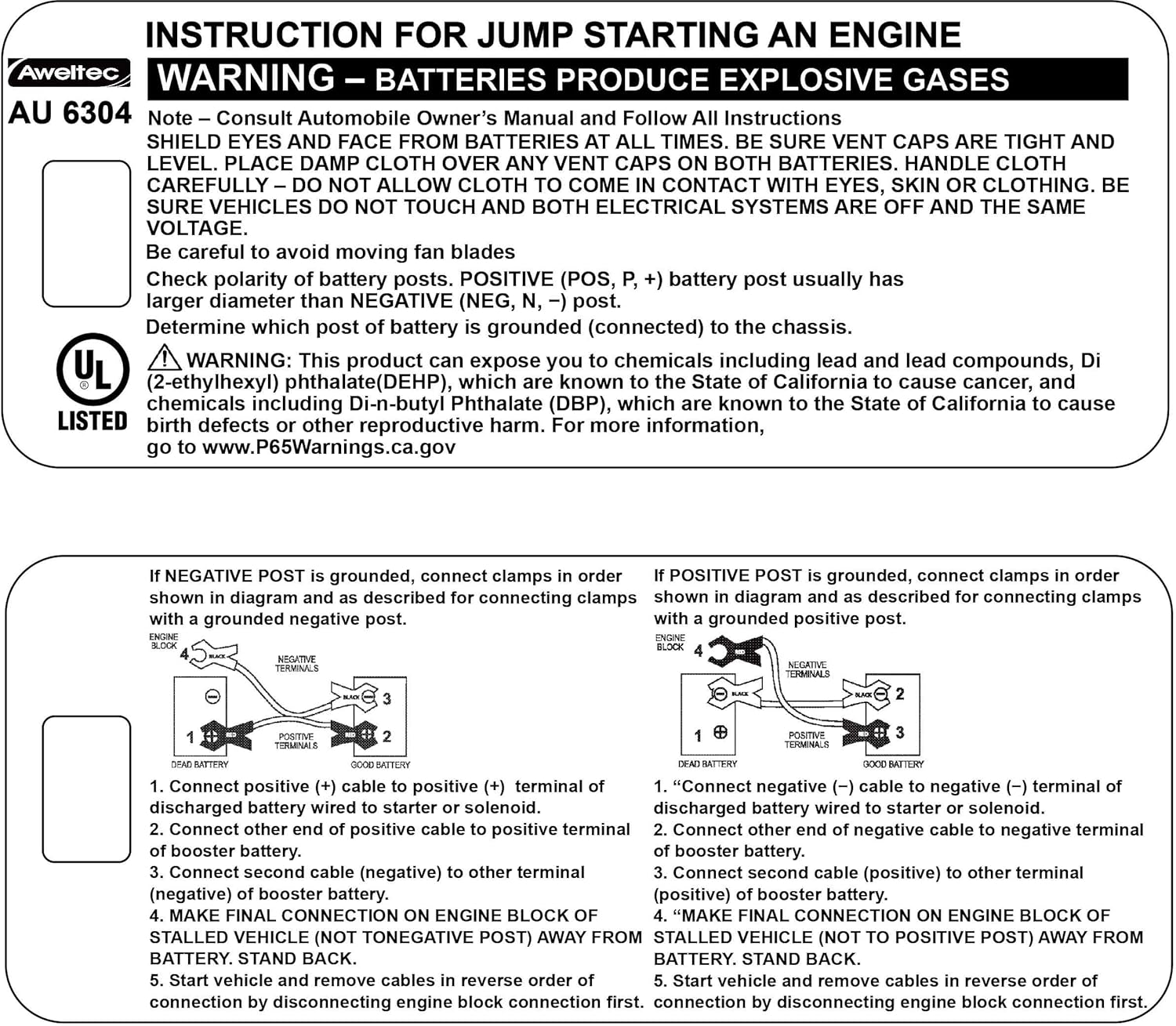 - AWELTEC UL-Listed Jumper Cables - 4 Gauge 20 Feet Automotive battery jumper cables for jump starting a dead or weak battery. High density copper clad aluminium make it has excellent conductivity. Perfect for most motorcycles, cars, SUVs and trucks with up to 5.0 L gas and 3.0 L diesel engine.
