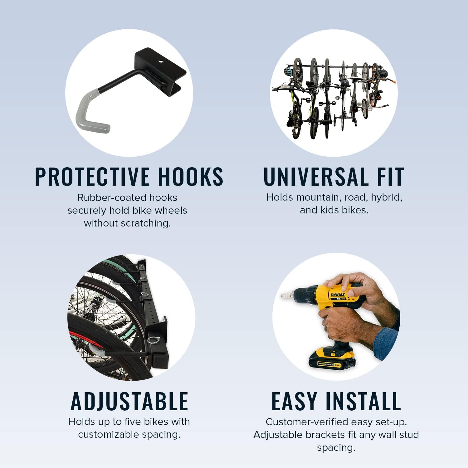 - Easy To Install – Mounts directly to wall studs using our Infinity Stud System for universal fit. Hang bikes by the front or rear wheel using rubber-coated hooks to prevent scratches and protect your gear.