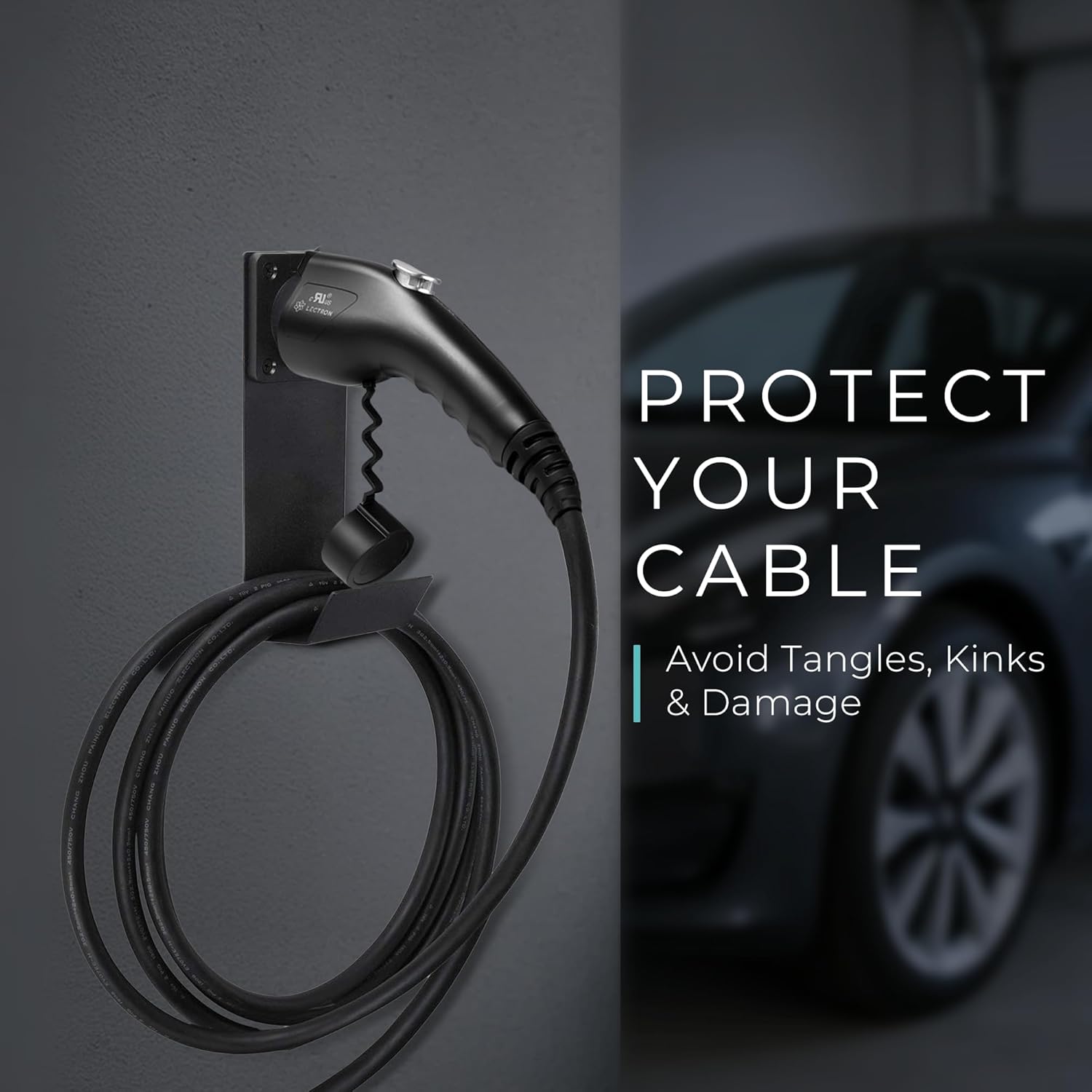 - SIMPLE TO USE β Compatible with all J1772 connectors. Insert your EV home charger into the dock until it clicks into place. The holster will latch onto the nozzle securely to keep it from falling out, so never again will you have to balance the charger precariously on a shelf. In addition, the hook will securely hold the cable off the ground to prevent the it from kinking and getting tangled, thus helping to extend the life of your EV Charger