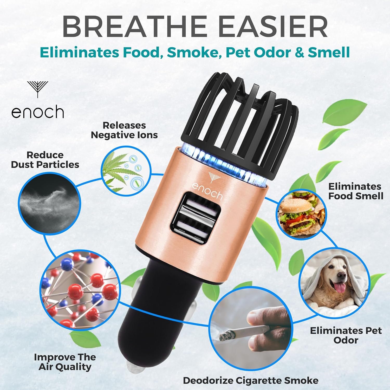 - ăPowerful Ionic Air Purifier for Car Odor Removală: Enoch Ionic Car Air Purifier releases up to 5.6 million negative ions per cubic centimeter to eliminate odors instantly including smoke, pet, food, and musty smells. These high-density negative ions bond with dust, pollen, allergens, and PM2.5 particles to neutralize airborne pollutants and improve car air quality. Enjoy a cleaner and fresher ride every time you drive.