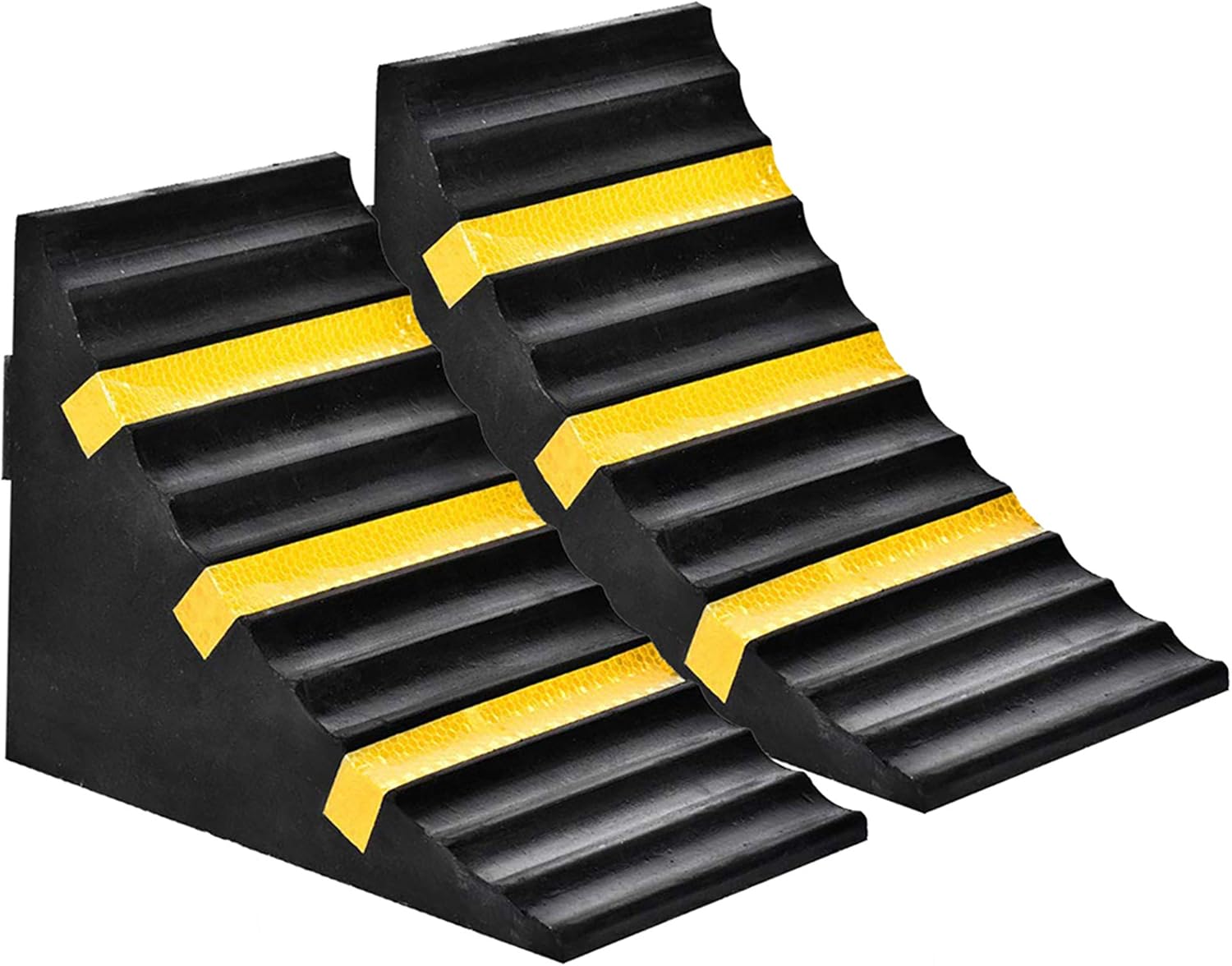 - 【Set of 2】Includes 2 Pack;Dimensions:10" x 6" x 7.3";Weight(Each): 6.8 Lbs,our professional grade solid rubber wheel chocks are great for helping you park your car,truck,SUV,RV,trailer and keep them in place.Extra large surface is great for large or small vehicles,like the wheels of hauler truck,fire truck and commercial vehicle.Perfect for Driveways,Garages or use with Vehicle Service Ramps or Leveling Ramps.Great Accessory for any Vehicle,Auto Shop or camping travel trailer.