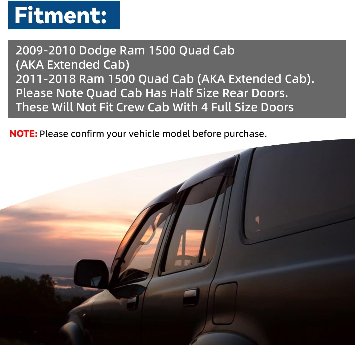 - Fit: 2009-2010 Dodge Ram 1500 Quad Cab (AKA Extended Cab); 2011-2018 Ram 1500 Quad Cab (AKA Extended Cab). Please Note Quad Cab Has Half Size Rear Doors. These Will Not Fit Crew Cab With 4 Full Size Doors