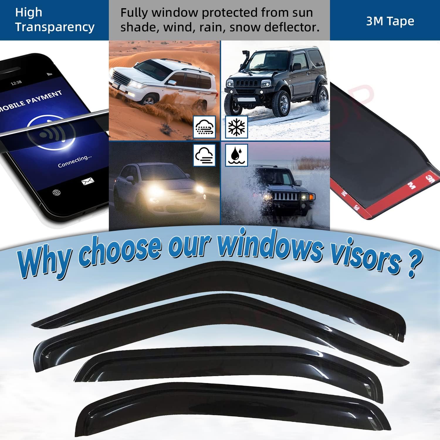 - Package Included: 4pcs front + rear vent window visors (3M Tape Included)