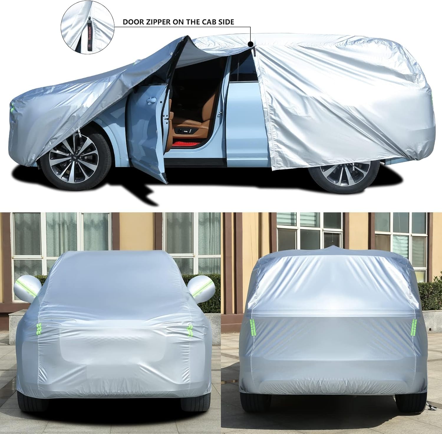 - Professional Design - 1. driver door classic zipper design for easy access and convenient. 2. windproof straps & elastic hem at front and rear to protect your car cover from blown away by heavy wind. 3. equipped with combination lock, security anti-theft. 4. reflective stripes remind others at night. 5. mirror pockets