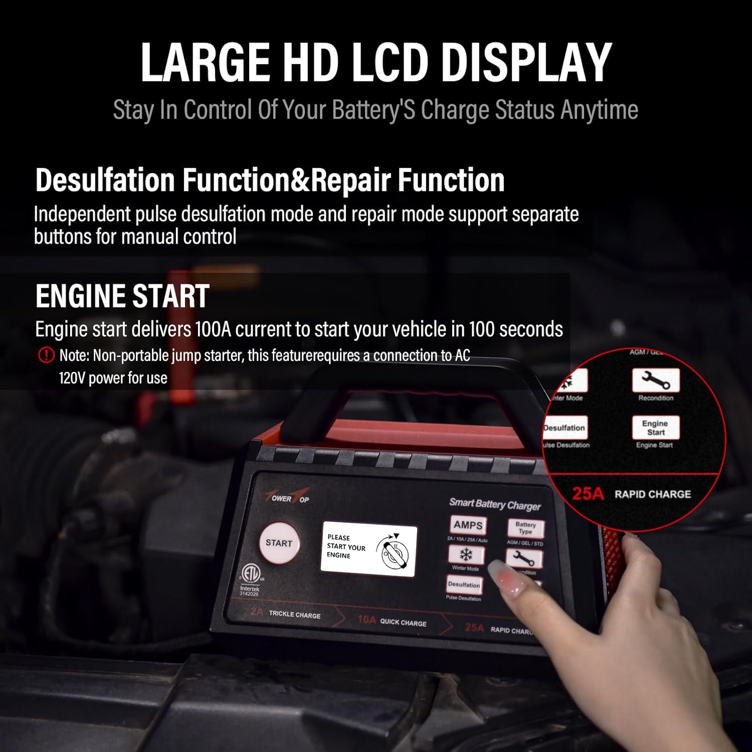 - Engine Start & Winter Mode: Engine start delivers 100A current helps activating your car battery to start your vehicle in 100 seconds. Winter Mode, +0.2v on the basis of the original charging voltage, better boosts your battery activity and charges more thoroughly in low-temperature situations