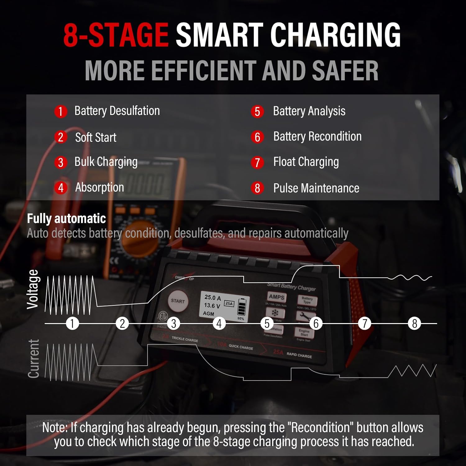 - HD LCD Screen and 8-Stage Intelligent Charging: With true 8-stage smart charging (desulfurization, soft start, bulk charge, absorption, analysis, repair, float, and pulse maintenance), it optimizes battery life and repairs batteries without overcharging or damaging them. The HD LCD screen allows you to view the charging stage and parameters at any time rather than leaving you guessing, keeping you informed of the charging status