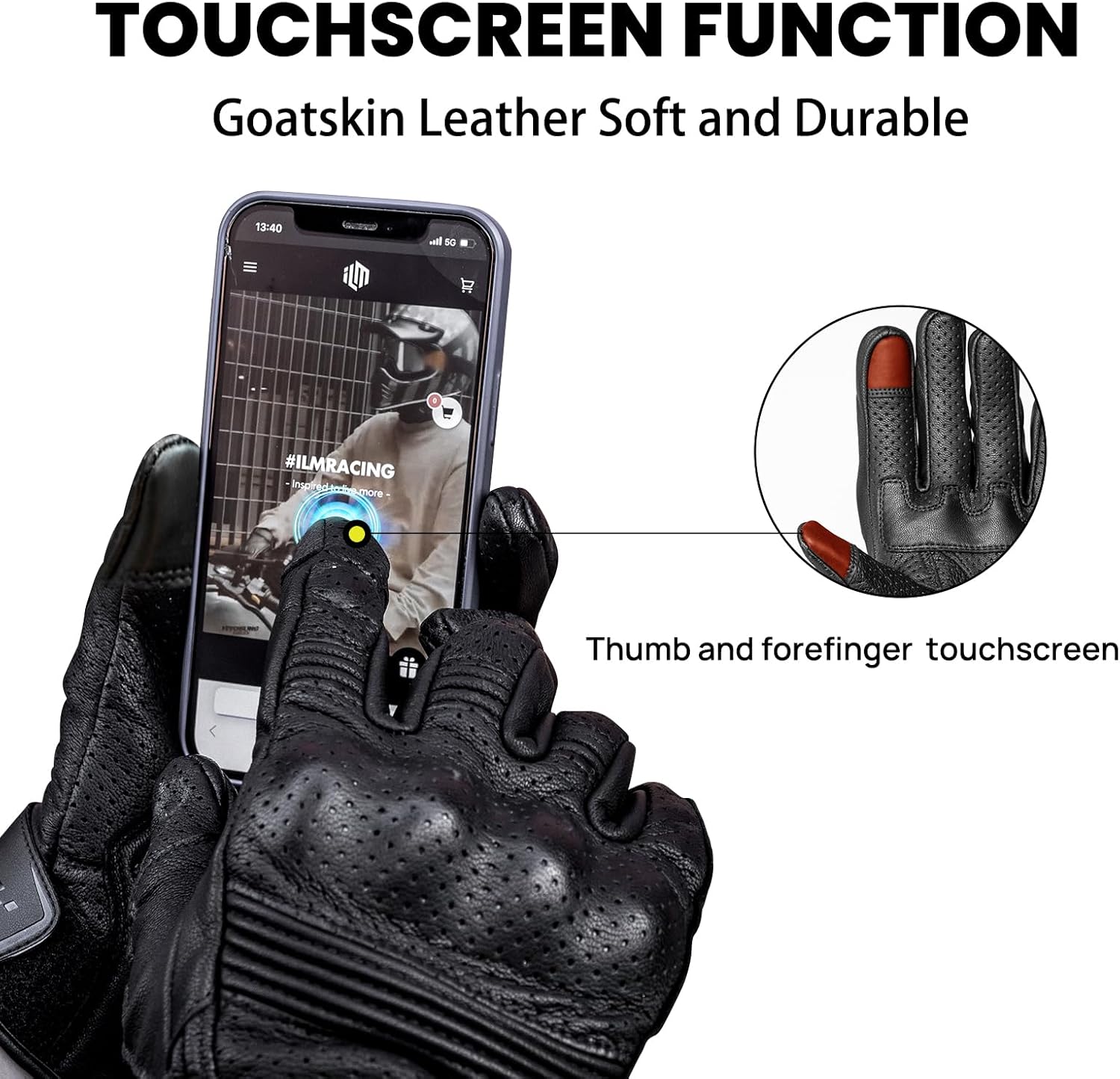 ILM Goatskin Leather Motorcycle Motorbike Powersports Racing Gloves Touchscreen for Men and Women Model DN01(XL, Black Unperforated)