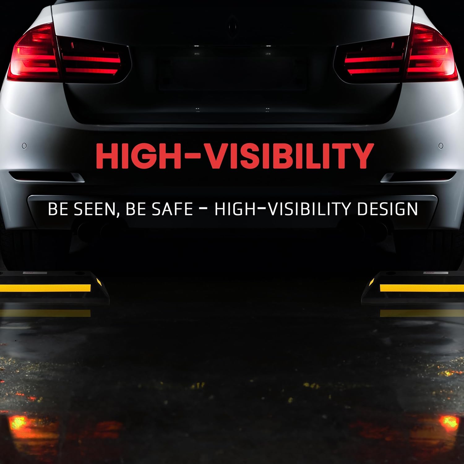 - MOUNTING HOLES: The car stopper for garage floor has integrated mount holes for permanent installation. Features bright yellow reflective safety strips on each parking target to improve visibility at night. Provides convenient parking assistance