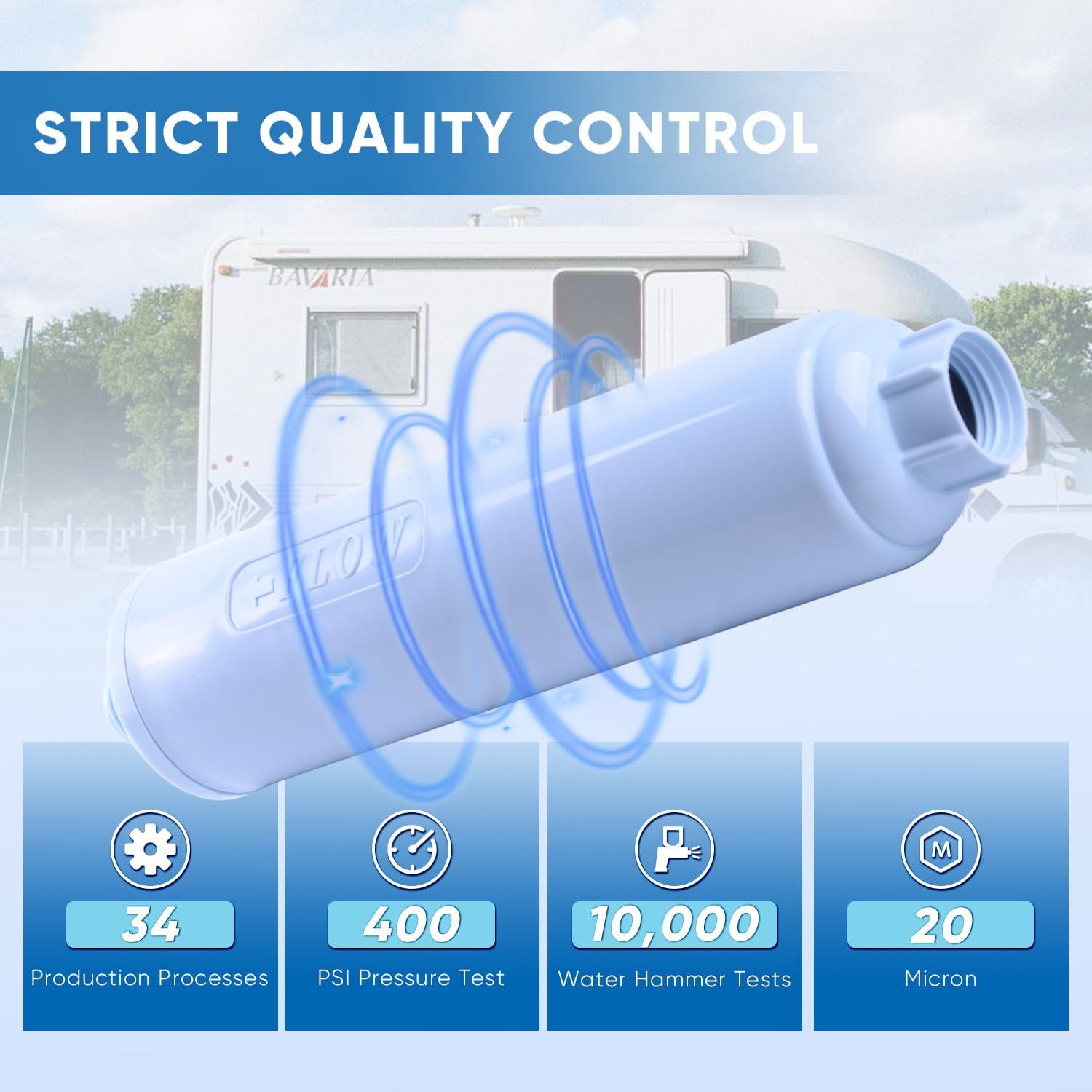 - ❄️【Strict Quality Control】All water filters for rv trailer are produced under the ISO9001, 14000 standard and inspected under strict quality control. Each filter is produced through 34 production processes, 400PSI pressure test, 10,000 water hammer tests, and 6 independent tests.