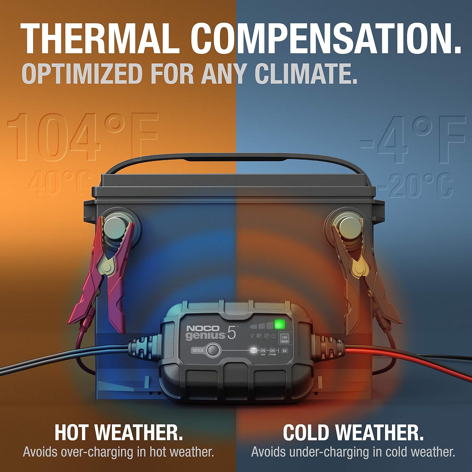 - ENJOY PRECISION CHARGING — An integrated thermal sensor dynamically adjusts the charge based on ambient temperature, preventing overcharging in hot weather and undercharging in cold, ensuring optimal battery performance.