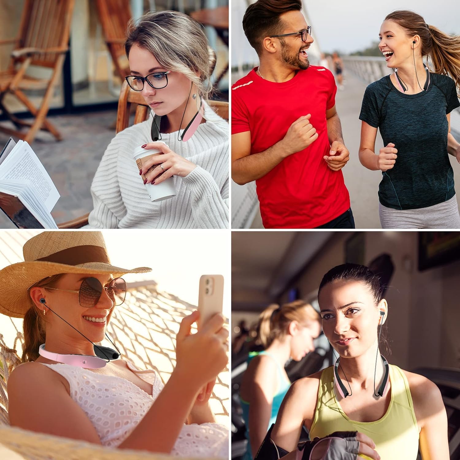- [Ergonomic neckband & Retractable Earbuds]: Ergonomic neckband design allow you to wear the headphones on your neck more comfortably and decrease the pressure of your ears. The Auto retractable earbuds allows you to pull the retractable earbud wire to the length you want and press the retract button can store the earbuds wire automatically.