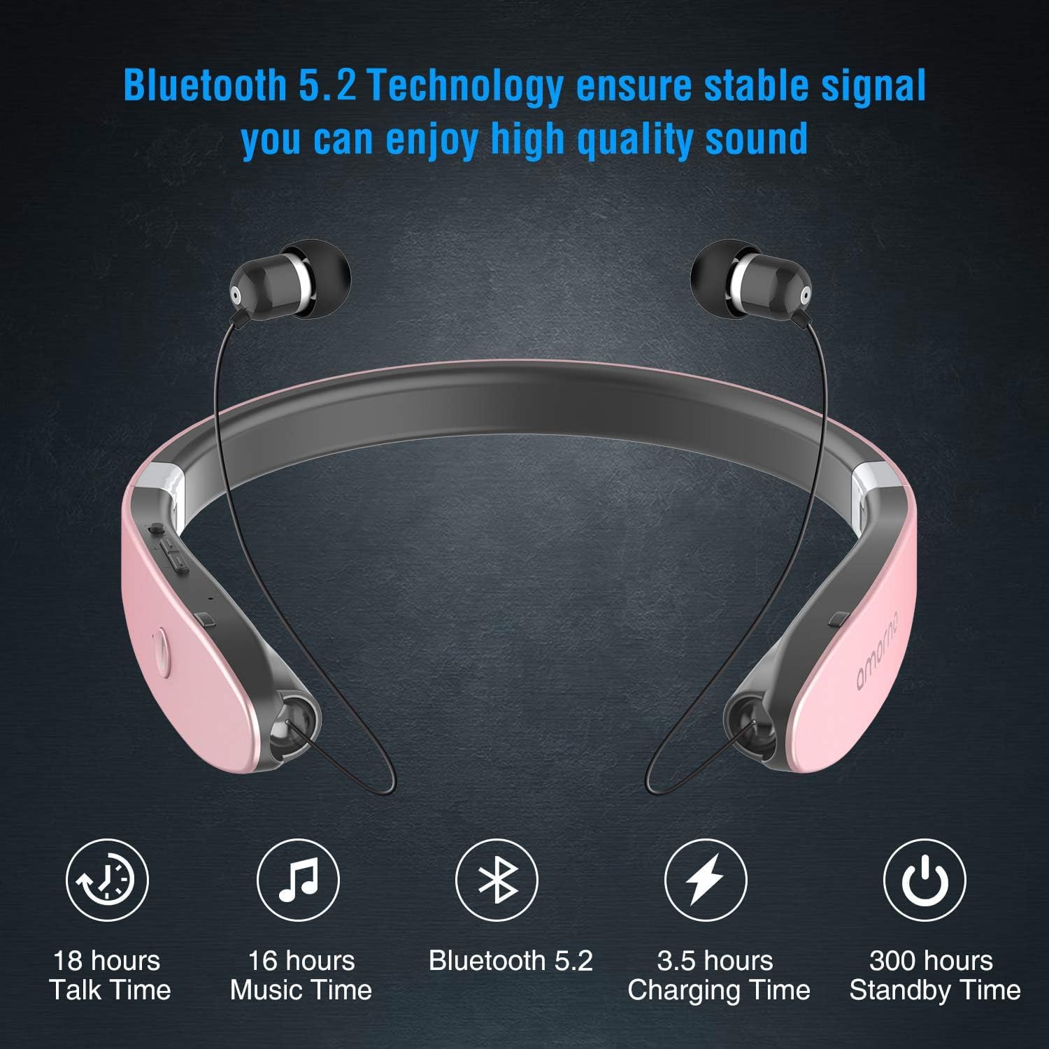 AMORNO Foldable Bluetooth Headphones Wireless Neckband Headset with Retractable Earbuds, Sports Sweatproof Noise Cancelling Stereo Earphones with Mic …
