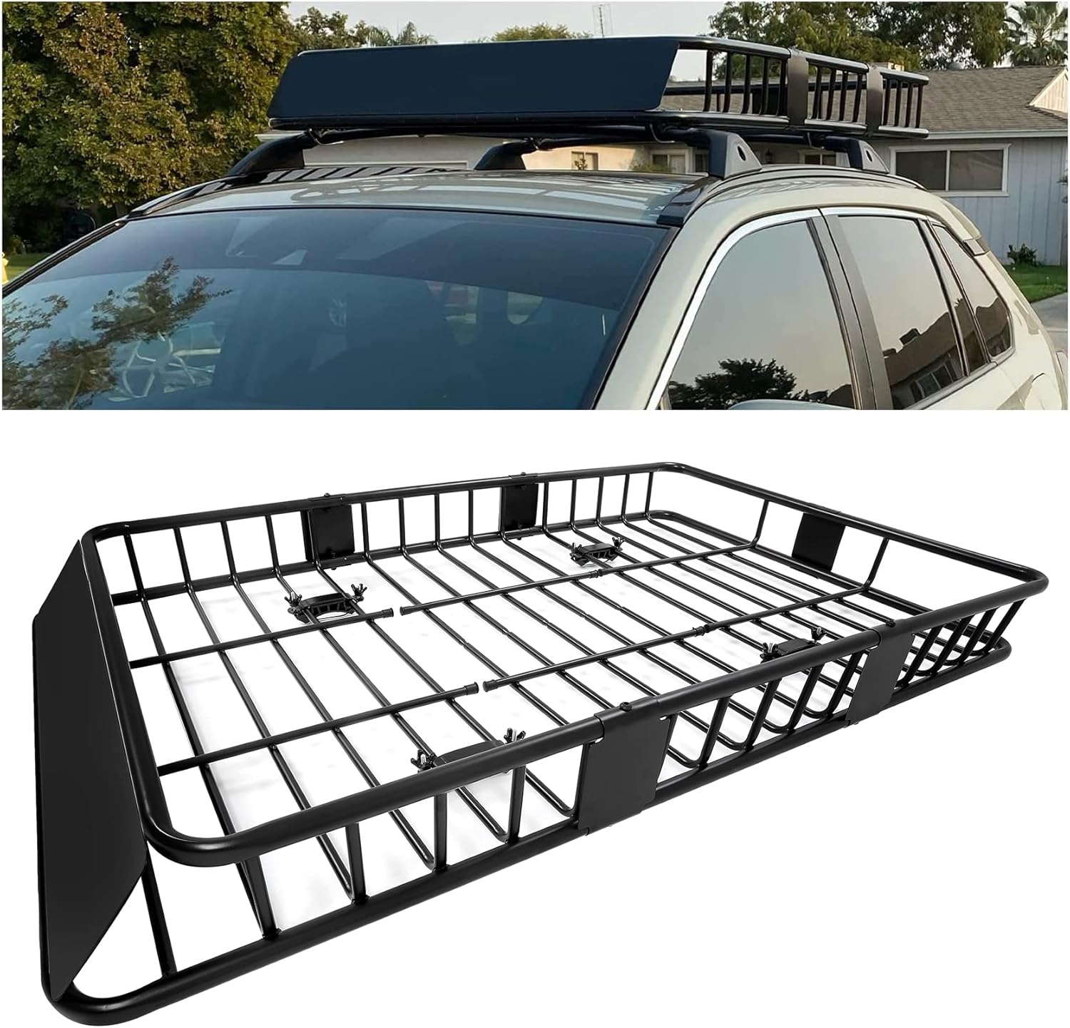 - Useful function: Use this roof rack to store hauling extra luggage, camping equipment, cargo bags and more. Built for the outdoor adventurers lifestyle. Easy to install with 4 universal U-bolts. The bottom metal bars and side rails provide plenty of tie down points. A steel wind fairing is also included. Carry big loads and mount accessories directly to the crossbars or straight bars of this roof rack cargo basket