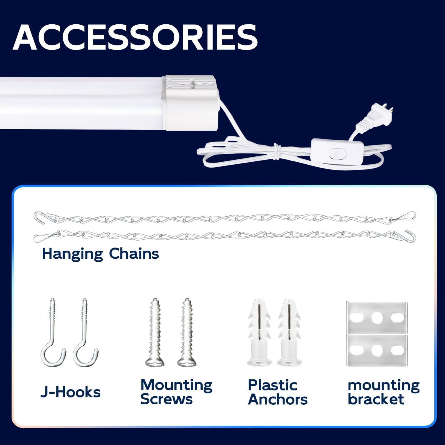 - β Easy Installation - Plug & Play. Come with 59" power cord with on/off switch and other small accessories. You can hanging it with the included hanging chains or directly mounted to the ceiling with the included mounting screws.