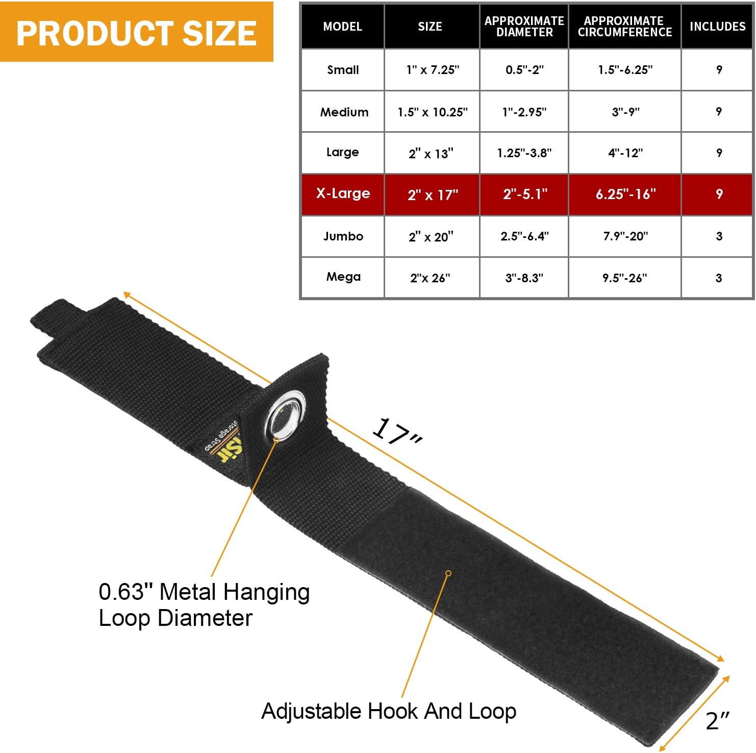 - Size information - A pack of 9 pcs 17 inches extension cord holder organizer. Max Wrapping Capacity Range (Circumference) is 6.25-16 inches and Max Wrapping Capacity Range (Diameter) is 2-5.1 inches, measures 9 inches in length and 2 inches in width when stored