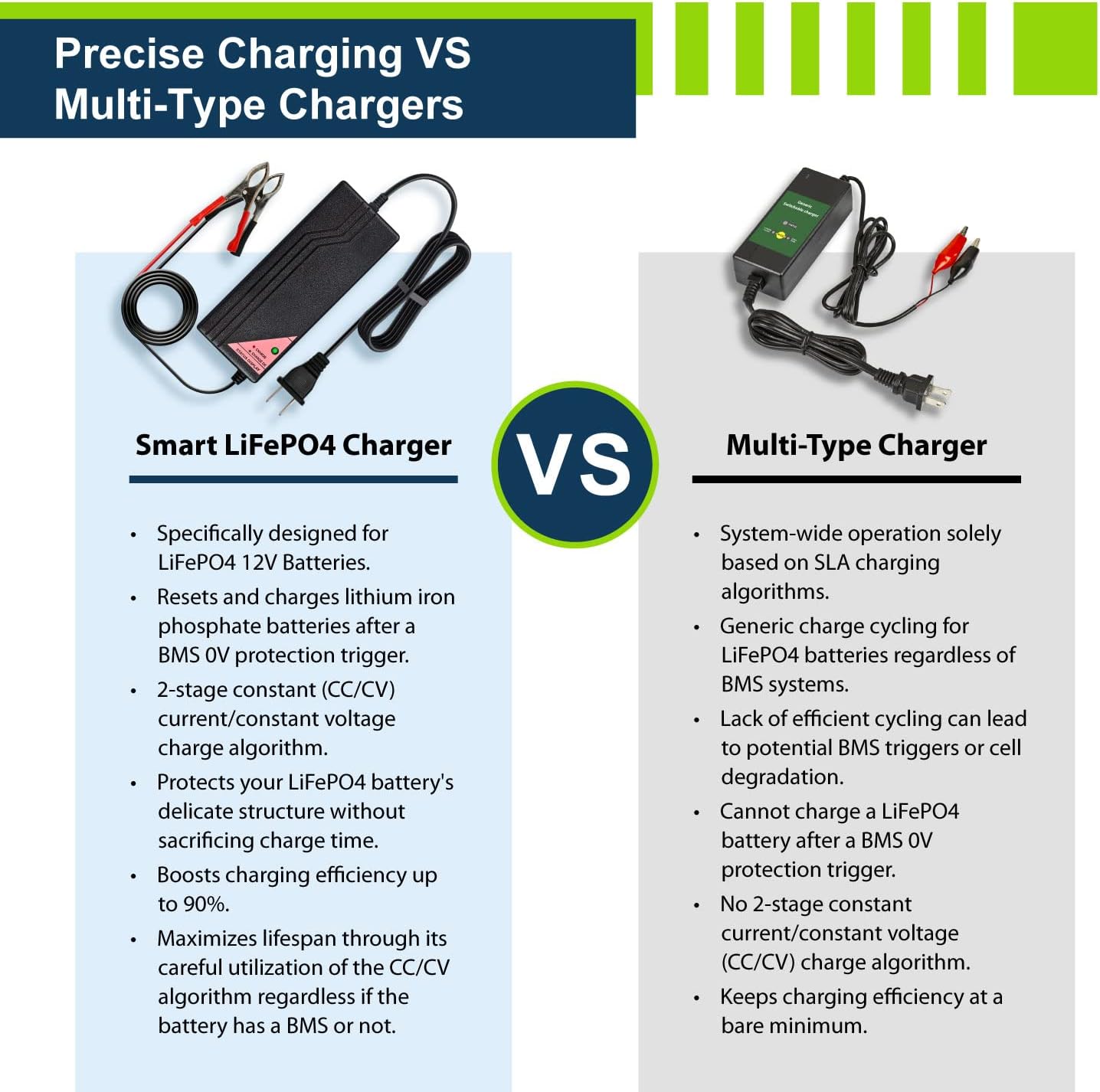 - Efficiently Easy : The charger protects your LiFePO4 battery's delicate structure by boosting charging efficiency and maximizing lifespan through its careful utilization of the CC/CV algorithm regardless if the battery has a BMS or not