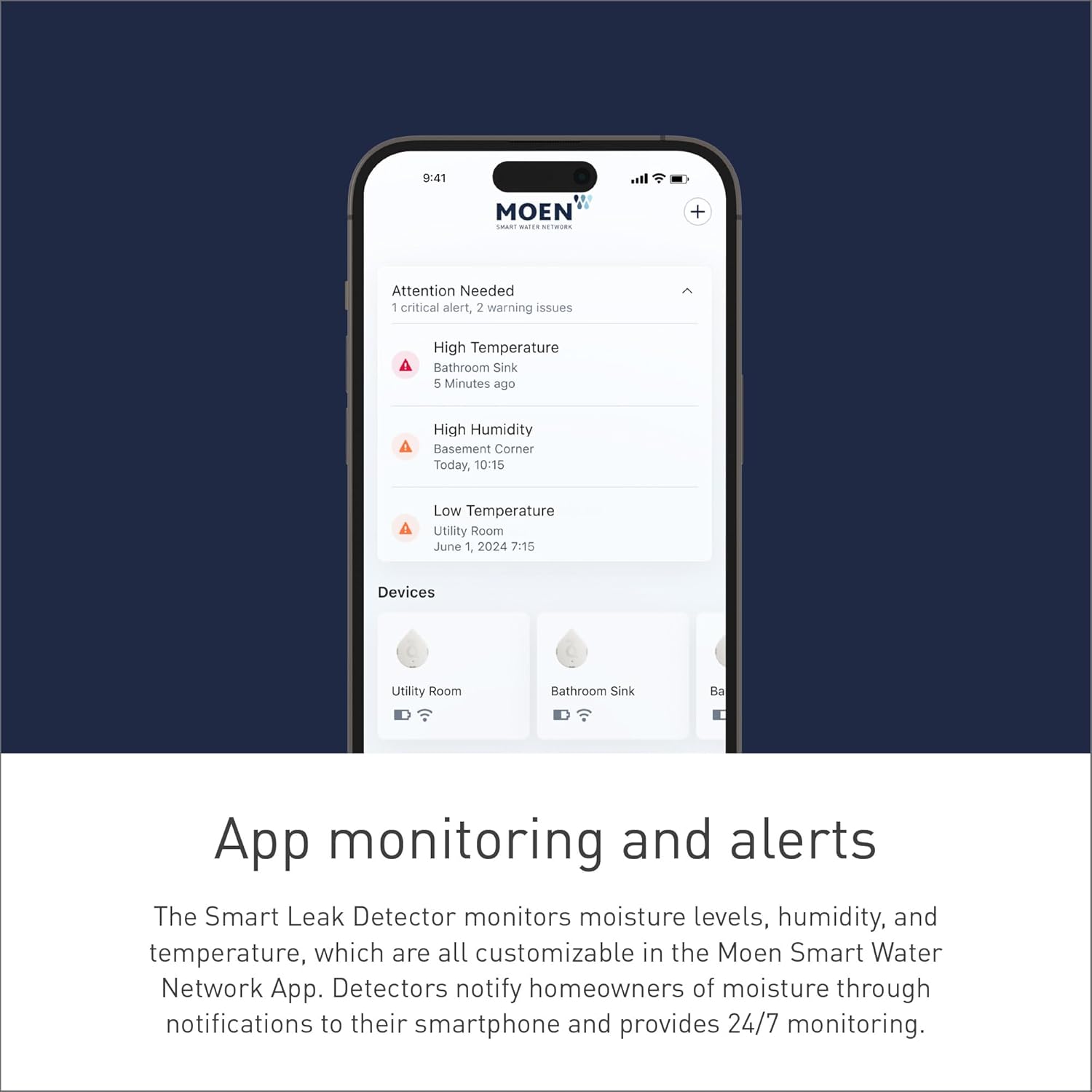 - REAL-TIME NOTIFICATIONS: Connects to the Moen Smart Water Network App to notify you of moisture through notifications to their smartphone; the app can also be customized to monitor moisture levels, humidity, and temperature