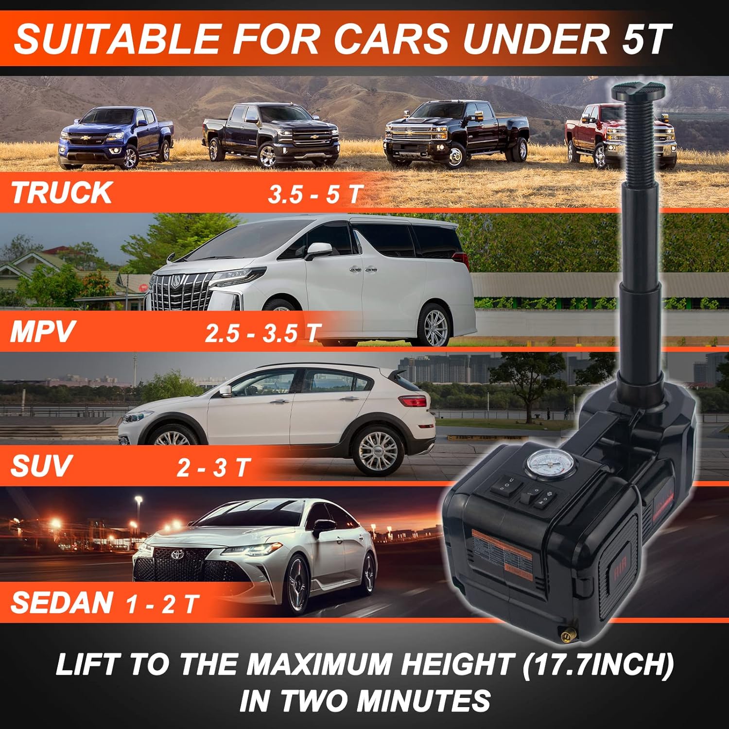 E-HEELP Electric Car Jack 5Ton 12V Kit Hydraulic (Lifting Range: 6.1~17.7 inch) with Inflator Electric Jack for Car SUV Sedan MPV Change Tires Garage Repair Emergency Kit