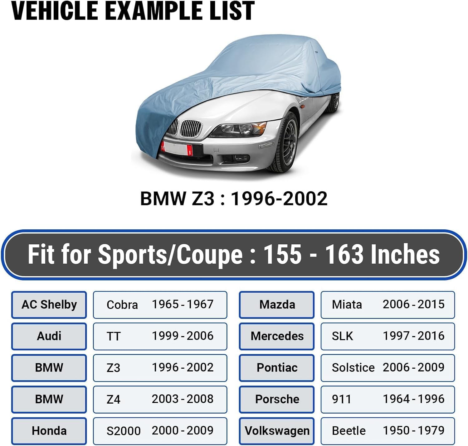 iCarCover 18-Layer Car Cover Waterproof All Weather, Premium Quality Car Covers for Automobiles, UV Protection, Z3, Z4, Crossfire, Solstice, Miata MX-5, Fits 155-163 Inches