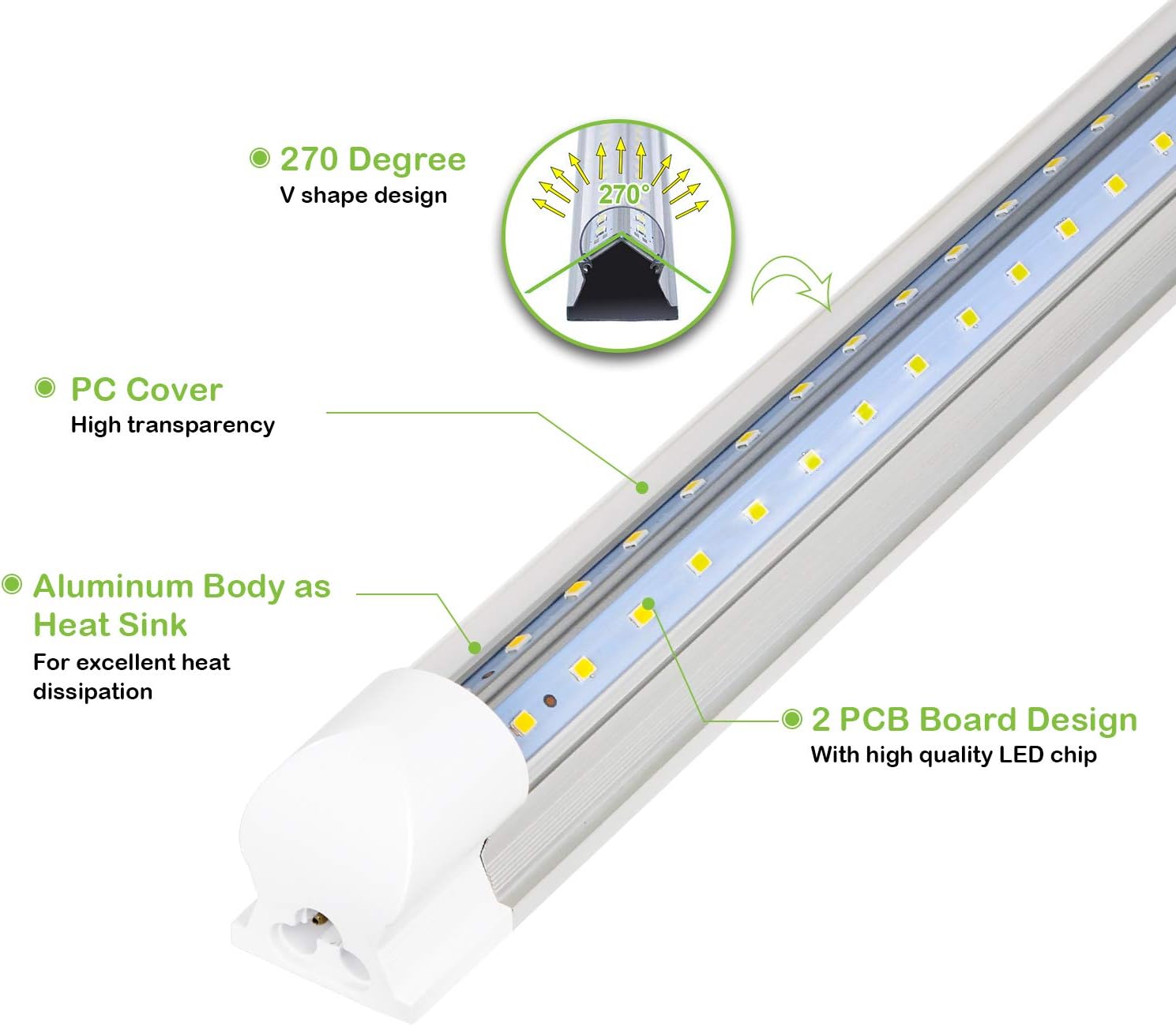 - 【Super Bright】 - V-shape designed T8 shop light provide a wide 270 degree beam angle, double row LED chips also ensure enough light to illuminate every dark corner of your space.