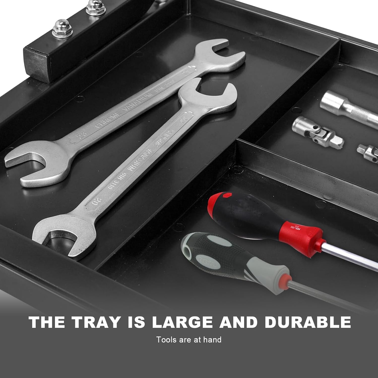 - Large, segmented tool tray storage keeps your tools and equipment within quick reach
