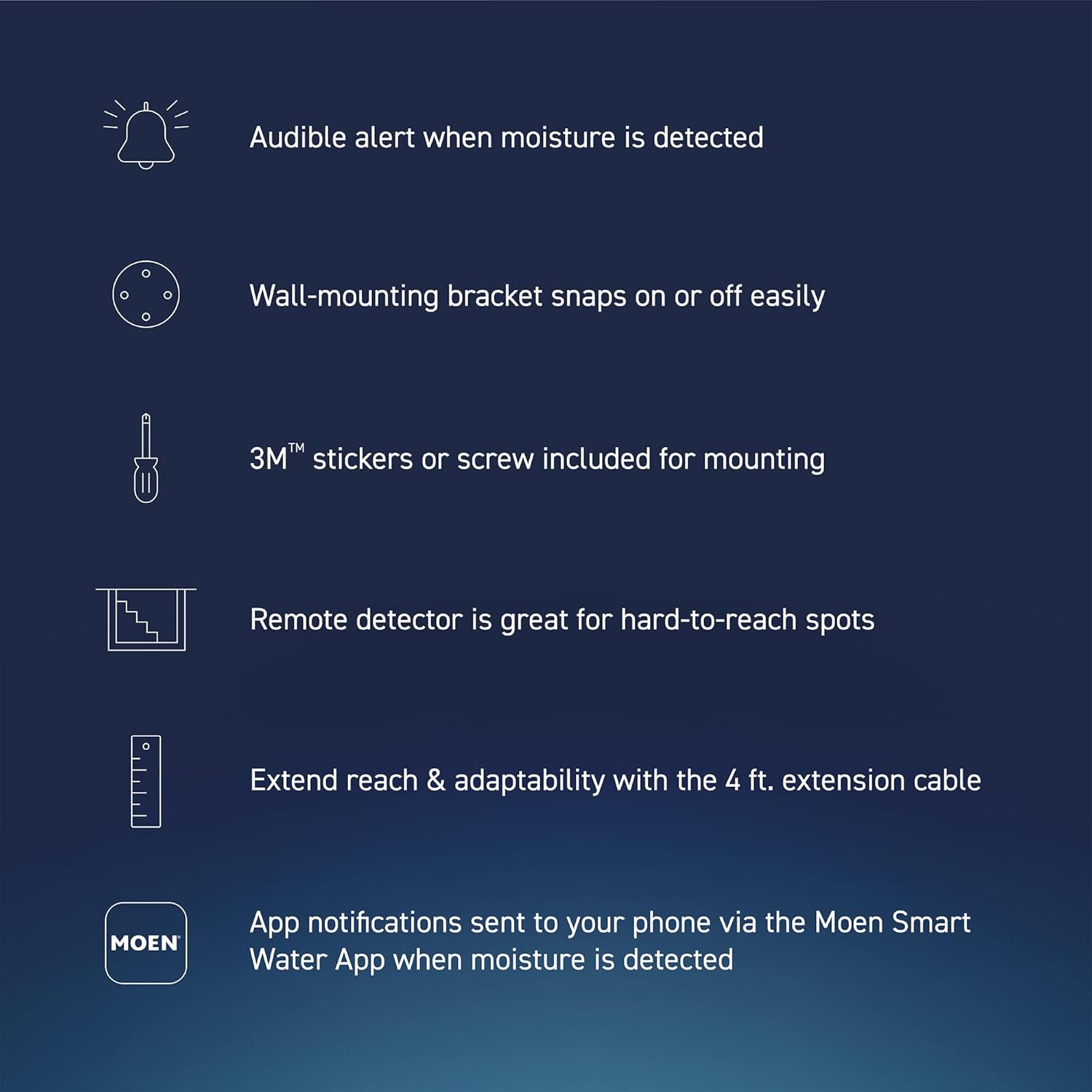 - THREE ALERTS: When water, excess humidity or extreme temperatures are detected, the unit sends an alert via the Flo by Moen app, sounds an audible alarm, or emits a blinking LED light