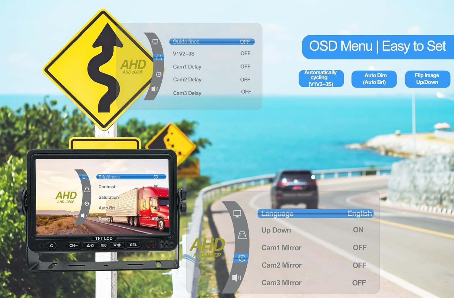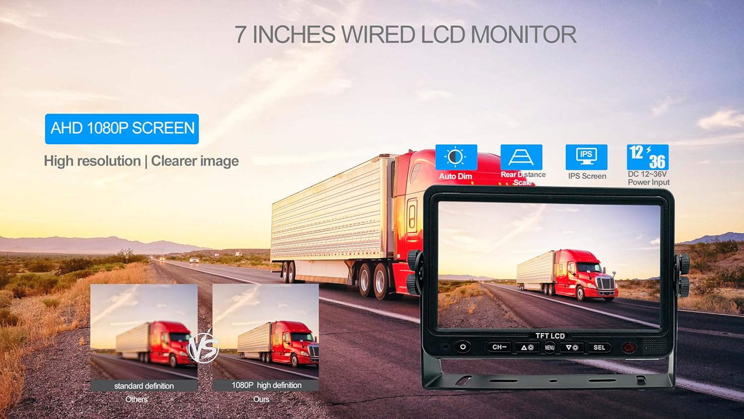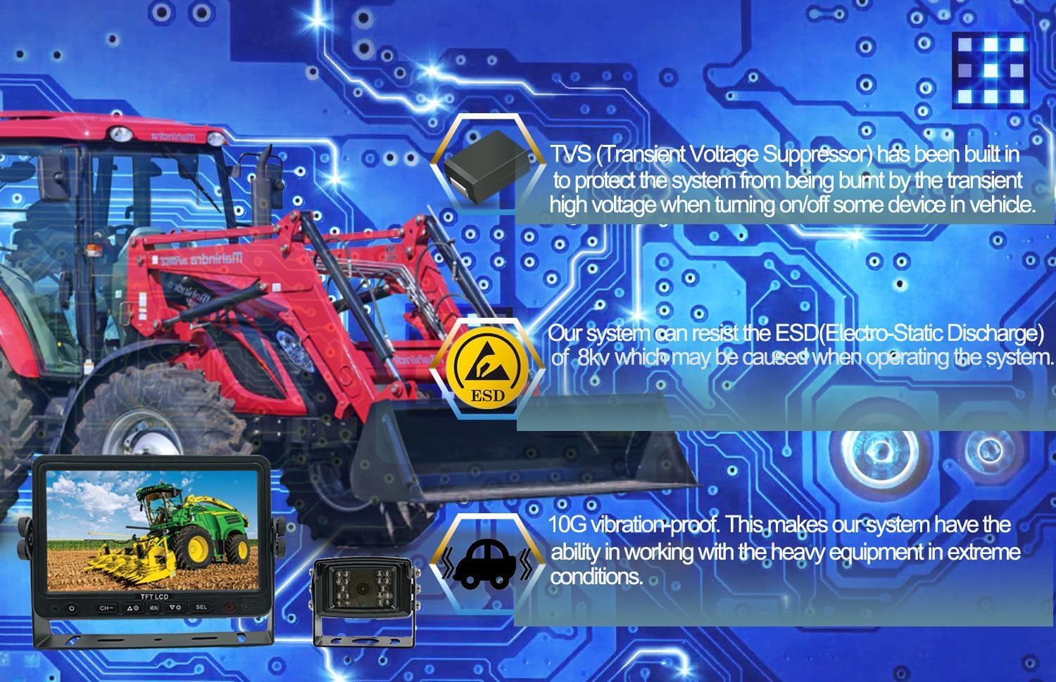 - Key Features:(1).Upgraded Industrial-Grade Chipset: Ensures reliable performance and durability for various vehicle. (2).10G Vibration Resistance: Withstand intense vibrations,making it ideal for heavy-duty vehicles and extreme conditions. (3).7β AHD 1080P Monitor: Delivers crystal-clear, high-definition visuals with 1080P resolution. (4).Heavy-Duty AHD 1080P Camera: Features a 120 degree viewing angle, IP69K waterproof rating and night vision for optimal performance in all weather conditions.