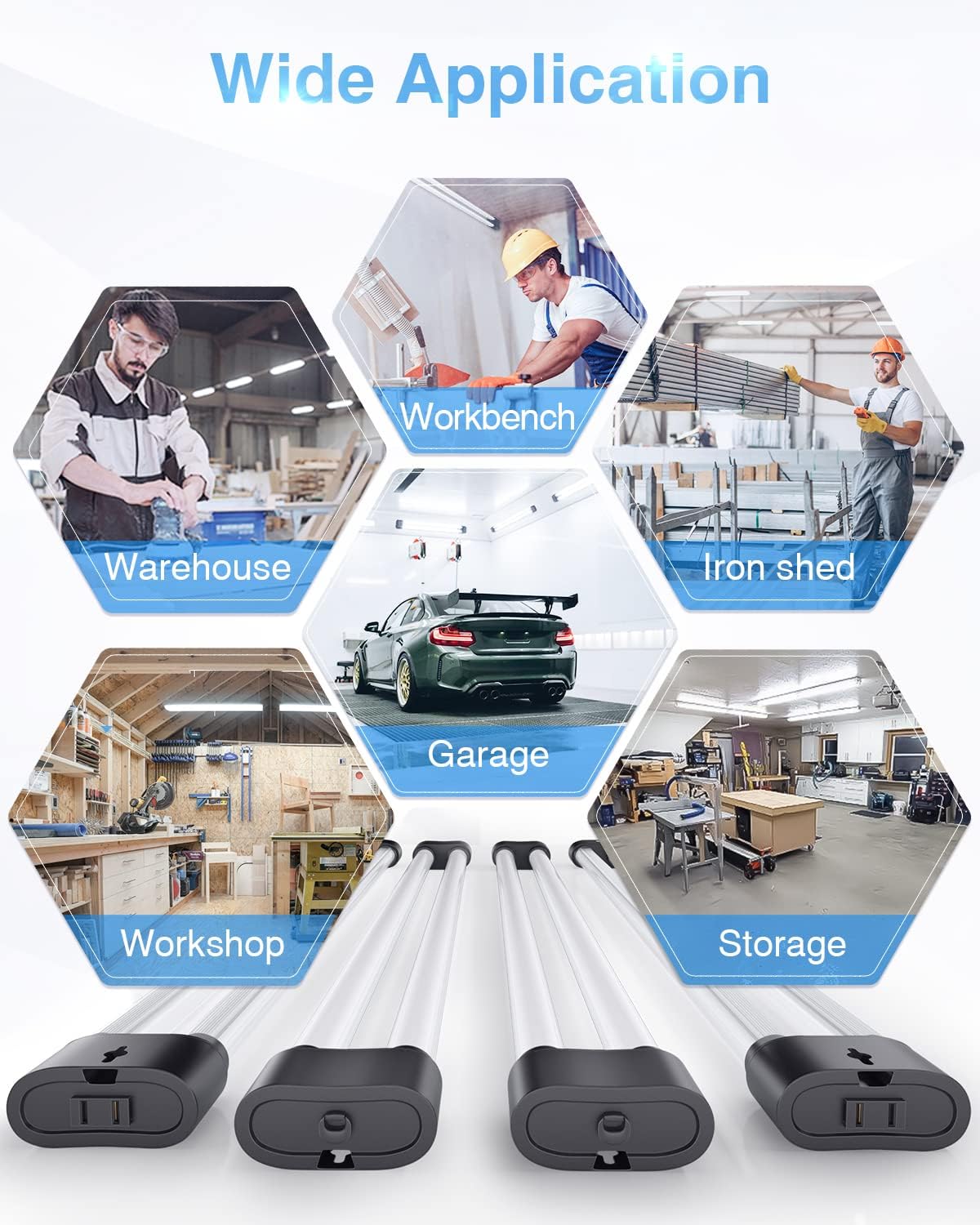 - 💡Easy Installation - Plug & Play. These 4FT led shop lights can be directly mounted to the ceiling or suspend from the ceiling in your garages, workshops, basements, etc. Quick and easy setup.