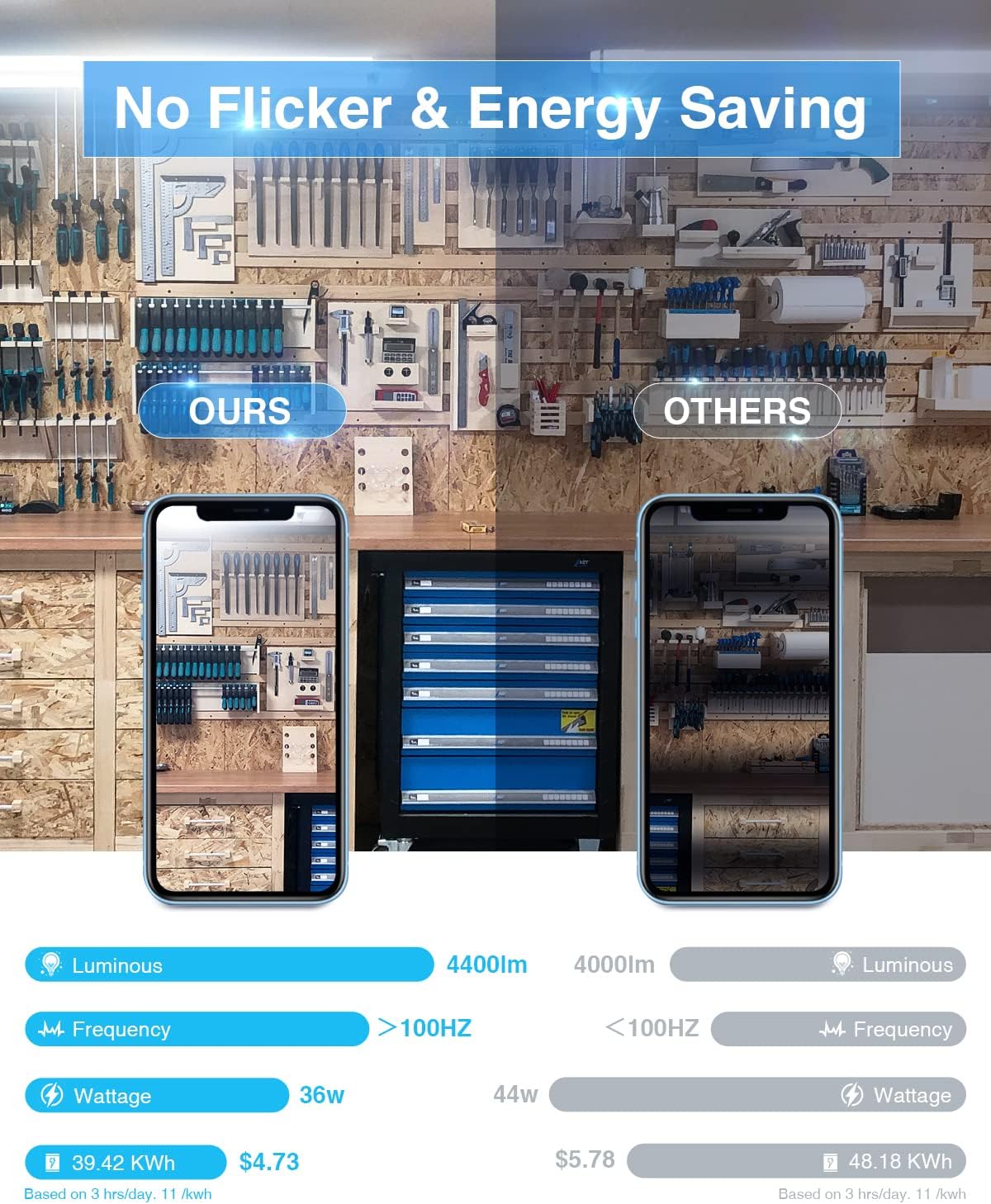 - 💡Super Bright - Our 4 ft shop light can provide 4400 high lumens with only 36W. It is an amazing LED efficiency of 122 lm/w! Excellent replacement for old fluorescent lamps! Energy saving of up to 80%.