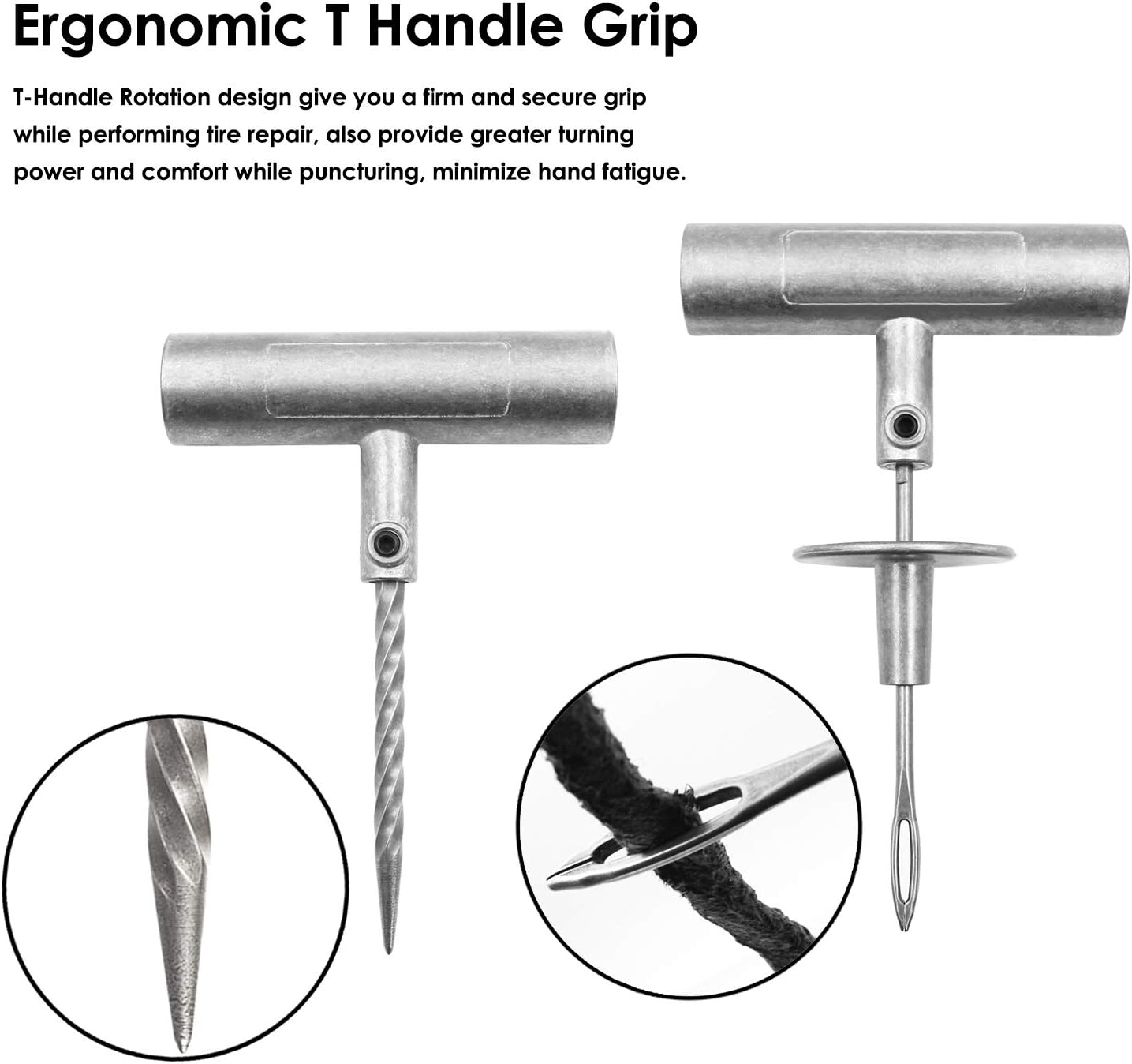 - The tire puncture repair kit is strictly complied with the top production standards. Sturdy T handle is made of heavy steel, provides greater turning power and feels great in your hand