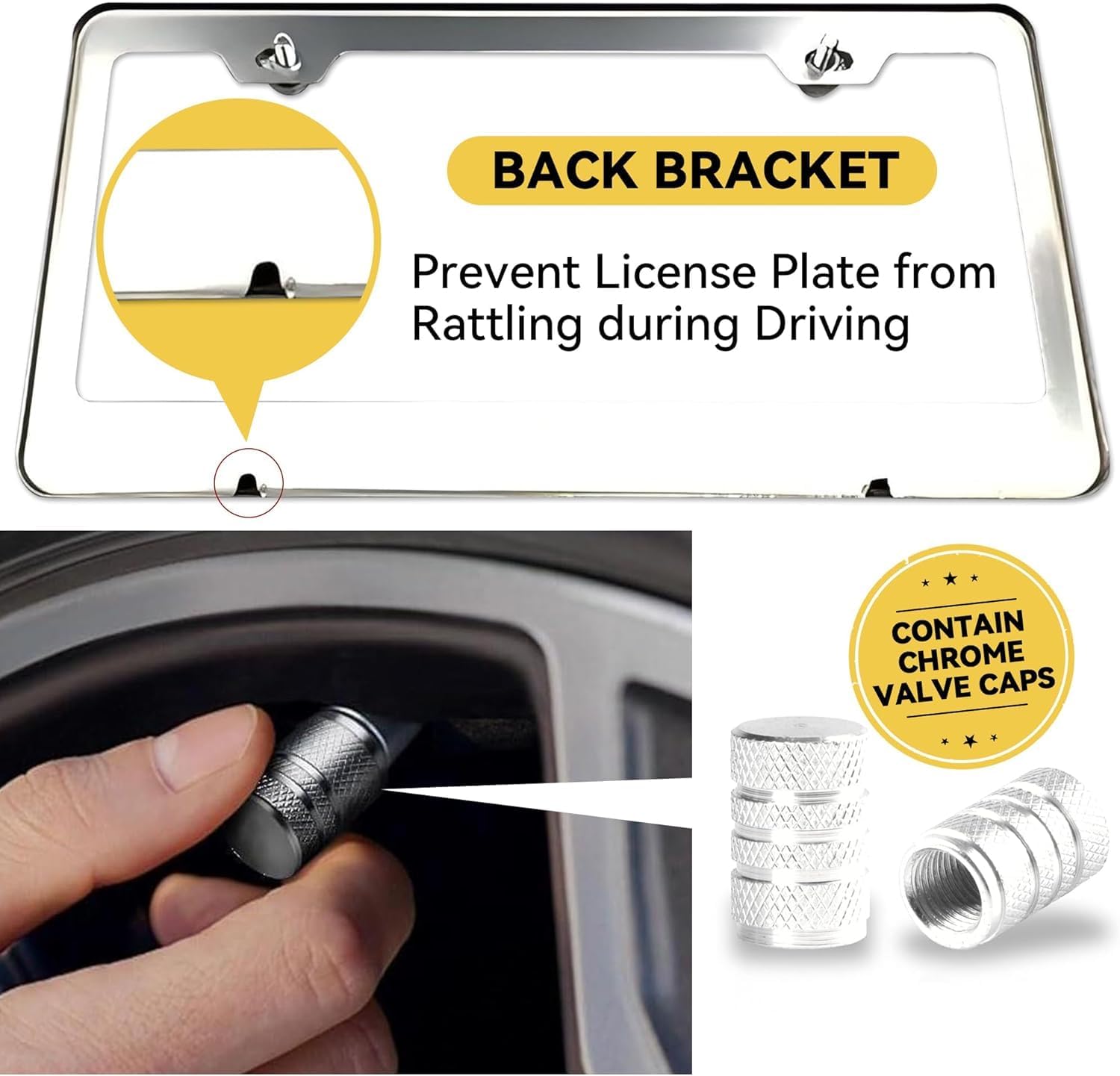 Mirror Polished Heavy Duty Stainless Steel License Plate Frame with Chrome Screw Caps, 2 Holes Rust-Proof Chrome-Like Finish Stainless Steel License Plate Frames 2 Pack