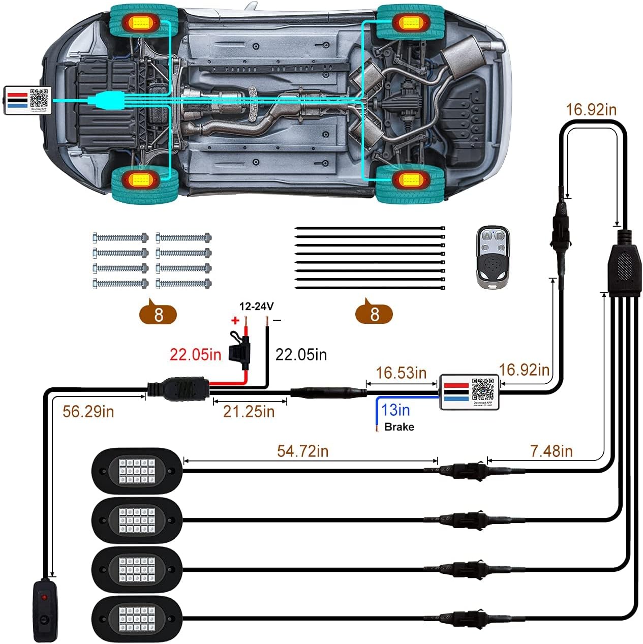 - [ Easy Installation & Widely Application ] β€ Sacn QR code on driver box or user manul to download APP, the app is compatible with iOS 7/Android 4.3 or above, switch on phone bluetooth quick connect APP to setup lighting effect. Rock Lights can be widely used not only Off Road, 4X4, Motorcycle, ATV/SUV/UTV, Boat etc., but also in indoor, chassis lights, deck lights, ambient light, neon lights, etc. If you need an extension cable, please purchase the asin: B08VN4G4H3.