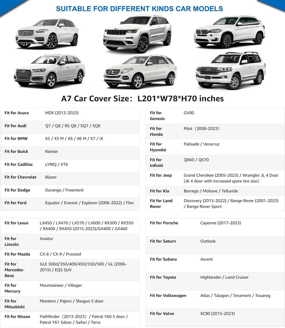- ăChoose the Right ModelăâŻâŻA7 suitable for jeep and SUV, Length 190-201 inches. (Not for hatchback sedan). For example Fit SUV--Toyota Highlander, Honda Pilot, Nissan Pathfinder/Murano, Bmw X5/X6, Audi q7, Lexus GX, Infiniti qx80/qx60/fx35, Acura mdx, Mazda cx9, Volvo xc90, Ford Explorer, Porsche Cayenne, Dodge Darango, Tesla Model X etc. If you are not sure if your model is a good fit, look at the fifth model table in the main figure.