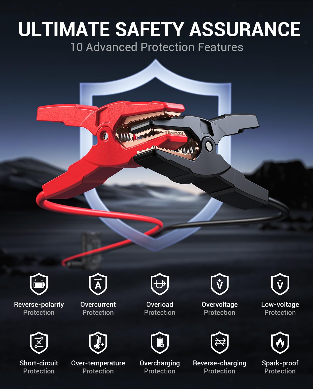 - Smart Safety Protection - The battery jump starter works with intelligent jumper clamps which provide 8 safety protections to ensure it's safe to use.โ Also, the jumper clamps indicator light will notify you of any common incorrect operating.