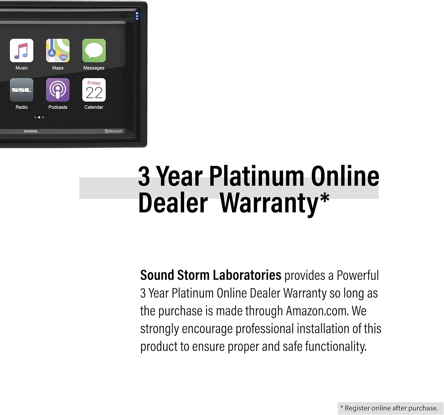 - Warranty - Sound Storm provides a powerful 3-year platinum online dealer warranty so long as the purchase is made through Amazon.com. We strongly encourage professional installation of this product to ensure proper and safe functionality