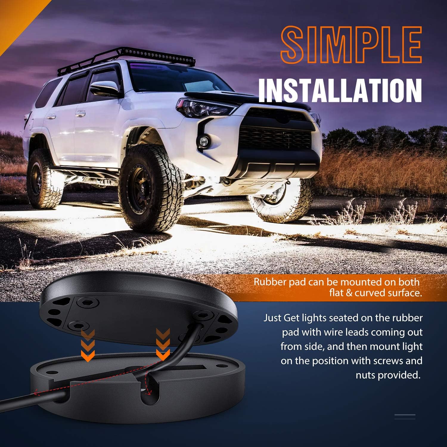 - Easy Installation: Get lights seated on rubber pads, with wires coming out from the side, then mount light on the position with screws and nuts. Rubber pad works on both flat and curved surface