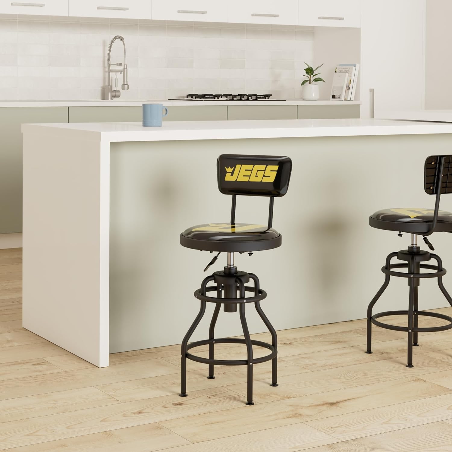 - 20 inches Width - Black seat shop chair, with JEGS Logo on the backrest.