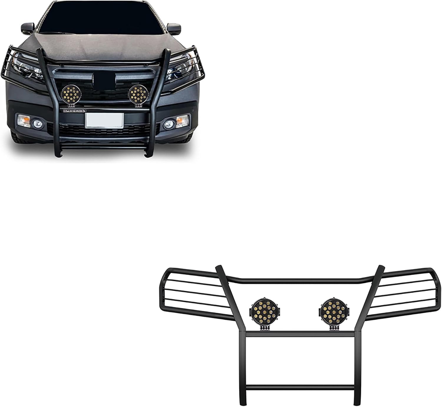 Black Horse Grille brush Bumper Guard Modular Come With pair of 7.0"Dia.LED Lights with Black Trim Rings Compatible with 2016-2019 Honda Ridgeline-17H01MA-PLB
